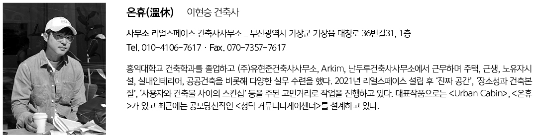 | 온휴(溫休) 설계자 | 이현승 _ 리얼스페이스 건축사사무소 건축주 | 이성수, 김종숙 감리자 | 허진성 _ 난두루건축사사무소 시공사 | (주)채헌종합건설 대지위치 | 부산광역시 기장군 기장읍 대청로36번길31 주요용도 | 단독주택(다가구주택) + 제2종근린생활시설(사무소) 대지면적 | 148.80㎡ 건축면적 | 89.20㎡ 연면적 | 257.95㎡ 건폐율 | 59.95% 용적률 | 173.35% 규모 | 4F 구조 | 철근콘크리트구조 외부마감재 | 점토벽돌 치장쌓기, 유로폼 노출콘크리트 내부마감재 | 단독주택 : 벽 - 친환경 수성페인트, 타일 / 바닥 - 강마루 / 천정 - 친환경 수성페인트, 자작나무합판 근생 : 벽 및 천정 - 유로폼 노출콘크리트 / 바닥 - 테라조 타일 설계기간 | 2019. 11 - 2021. 03 공사기간 | 2021. 04 - 2023. 03 사진 | 리얼스페이스 건축사사무소, 박영채 구조분야 | (주)세움구조엔지니어링 기계설비분야 | (주)민성엔지니어링 전기분야 | (주)전기설계 협인 |