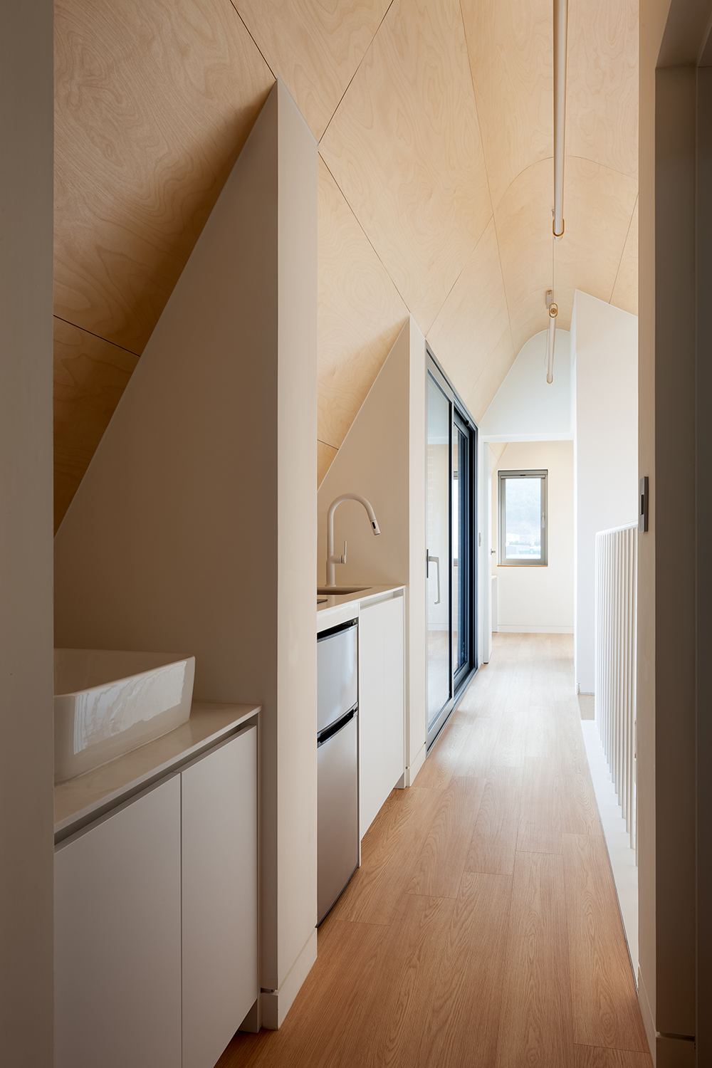 북측 일조권 사선제한을 최대한 활용하고자 사선 하부의 자투리 공간을 세면대와 작은 싱크 공간으로 계획해 공간 활용성을 극대화했다. 또 북측 1:2 각도의 사선에 대응하는 남측 사선을 맞대어 어긋난 각도의 박공을 만들면서 동시에 내부의 용마루는 완만하게 휘어잡았다. 이는 외부 디자인 어휘를 최대한 내부까지 유지해 ‘온휴’라는 이름에 걸맞은 따스한 휴식이 가능한 곡면, 즉 온곡(溫曲)의 공간이 될 것이다.