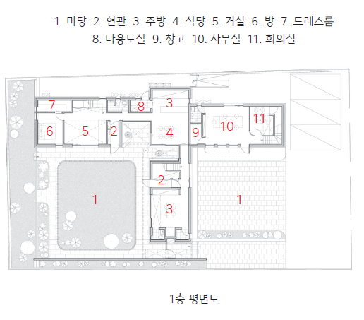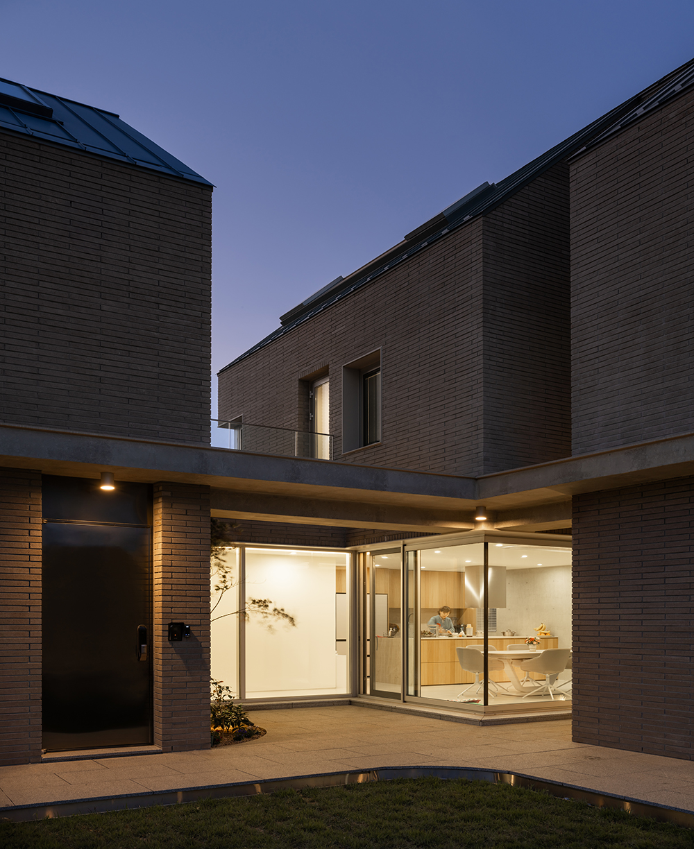 골칫거리인 남측의 창고는 높은 가벽으로 가리고, 논밭과 영축산이 보이는 서측은 낮은 담장으로 경계는 구분하되 충분히 열어 전원의 풍경을 담아낼 수 있도록 했다. 그로 인해 ‘우리 집’ 만의 안락하고 쾌적한 마당이 생겨났다. 그 마당을 ‘ㄱ’자로 위요한 건물은 각각 부모님 세대와 자녀 세대가 분리되어 각자의 사생활을 보장받는다. 두 세대가 만나는 중심에는 주방과 식탁이 있다. 그곳에서 삼대가 끼니를 같이 한다. 첫 미팅 때 뱃속에 있던 탄탄이는 이제 마당을 뛰어다니고, 할머니와 주방에서 유치원에서 있었던 일을 이야기하며, 엄마 아빠와 손을 잡고 다락 놀이방으로 간다.