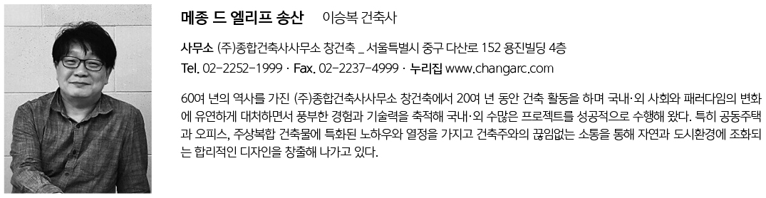 | 메종 드 엘리프 송산 설계자 | 이승복 _ (주)종합건축사사무소 창건축 건축주 | 계룡건설산업(주) 감리자 | (주)종합건축사사무소 창건축 시공사 | 계룡건설산업(주) 설계팀 | 정원영, 박찬식, 윤승균, 송영기, 조성용, 우광철 설계의도 구현 | (주)종합건축사사무소 창건축 대지위치 | 경기 화성시 새솔동 EB2, EB3 주요용도 | 공동주택(단지형 연립주택) 대지면적 | 23,924.70㎡(EB2) / 18,177.70㎡(EB3) 건축면적 | 8,240.18㎡(EB2) / 6,578.93㎡(EB3) 연면적 | 24,826.05㎡(EB2) / 20,191.72㎡(EB3) 건폐율 | 34.44%(EB2) / 36.19%(EB3) 용적률 | 75.55%(EB2) / 78.50%(EB3) 규모 | B1F - 3F 구조 | 철근콘크리트구조 외부마감재 | 치장벽돌(주.동국세라믹, 코코세라믹.주, 주.현성세라믹), 징크판넬(동국제강), 불소수지도장 내부마감재 | 벽지, 마루, 타일 설계기간 | 2020. 10 – 2021. 10 공사기간 | 2021. 10 – 2024. 01 사진 | 서연준 _ y208 studio 구조분야 | (주)티섹구조이앤씨 기계설비분야 | (주)현우엠이씨 전기분야 | (주)한양티이씨 소방분야 | (주)현우엠이씨, (주)한양티이씨 |