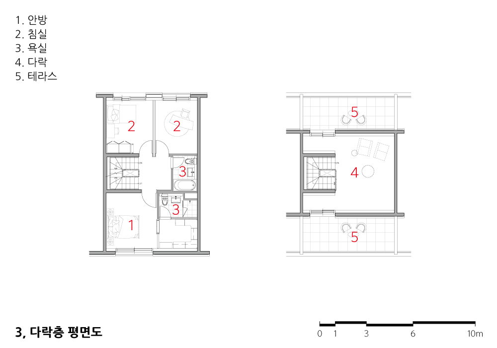 Each unit is vertically structured, with the first floor planned as piloti spaces, excluding the entrance, allowing for diverse living spaces such as camping areas, exercise spaces, and traditional porches based on residents’ preferences. Residents can cultivate small gardens and vegetable patches in their private gardens. The kitchens and bedrooms on the second and third floors allow families to enjoy time together without worrying about noise between floors. The attic can be customized for hobbies or a study, and the terrace offers a great view of Songsan’s natural scenery for emotional camping experiences.