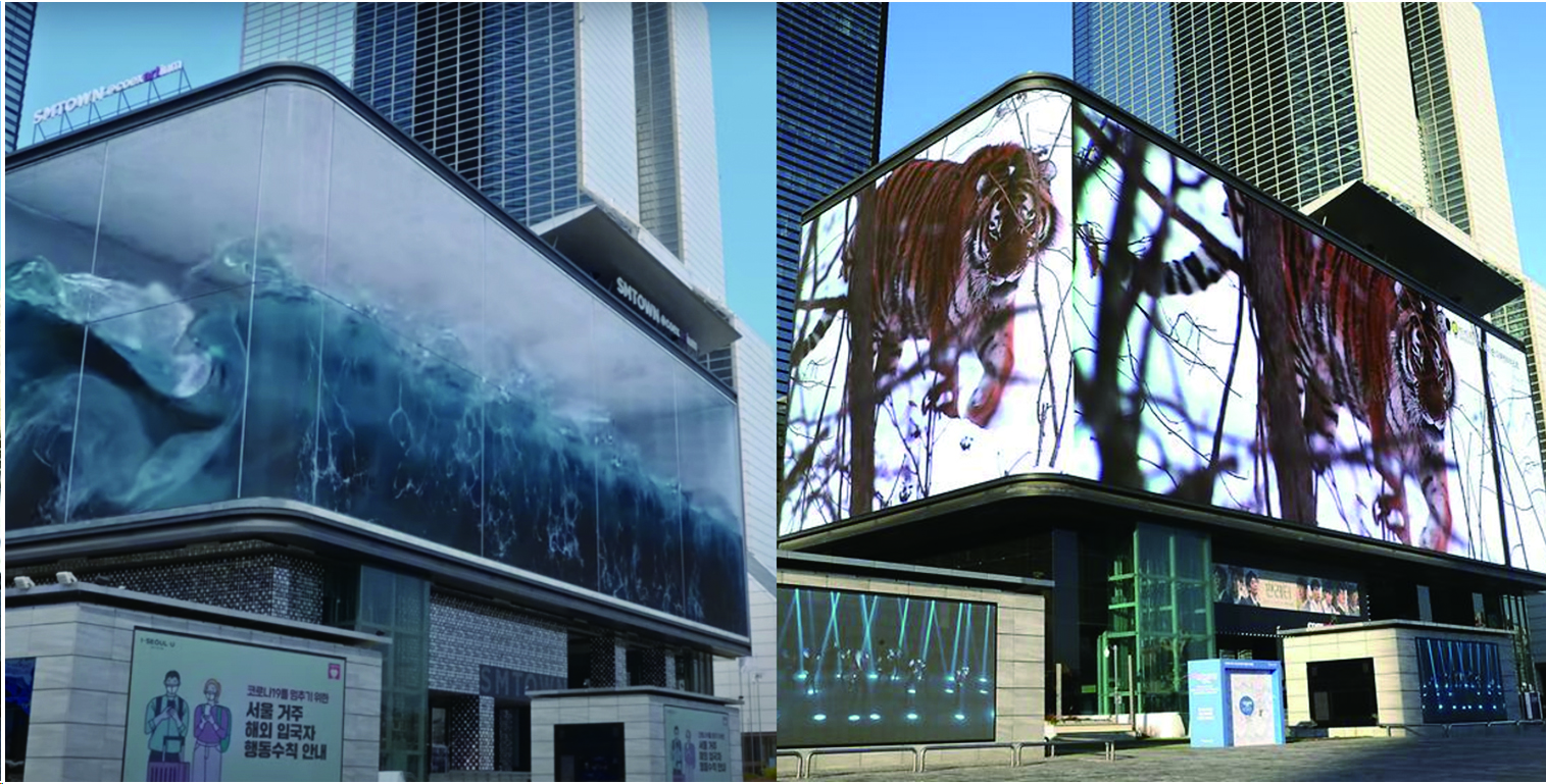 길을 걷다가 SM타운 외벽에 상영되는 영상을 보기 위해 일부러 멈춰 서기도 한다. 파도가 ‘출렁’하고 쏟아져내리기도 하고, 호랑이가 툭 튀어나오기도 한다. 대형 디지털 광고판에서는 상업 광고 영상뿐 아니라 30퍼센트 정도의 비율로 상업적 목적이 없는 영상도 방영된다. 한 해가 가고 오는 것을, 계절이 바뀌는 것을 광고판의 화면을 보고 확인한다. 계절을 알리는 황금빛 들판이나 단풍이 물든 산은, 빌딩의 대형 광고판보다 언제나 아주 멀리 있기 때문이다.