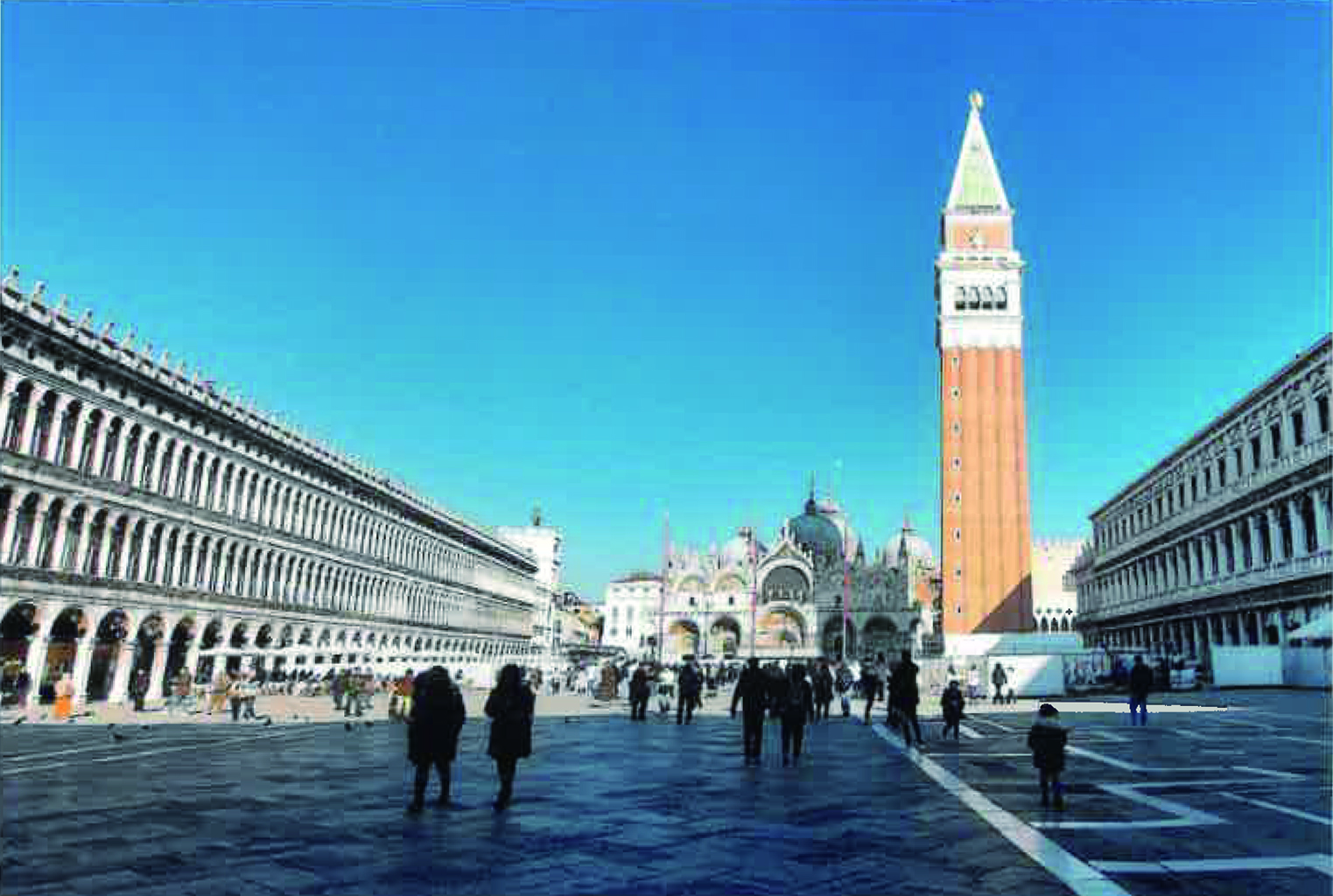 유럽에서 가장 큰 산 마르코(마가복음의 성마가를 이탈리아 식으로 부르는) 광장의 역사는 9세기세워진 두칼레궁전과 산마르코 성당이 12세기 운하를 메꾸면서 광장이 확장됐다. 16세기 로마인 아키텍트에 의해 르네상스 문화가 융합한 도서관, 종탑, 아랫부분의 기둥 등 공용건축이 들어섰다. 19세기에 나폴레옹에 의해 광장의 서쪽에 나폴레옹 관을 더해 현재의 모습을 갖추게 되었다 한다.