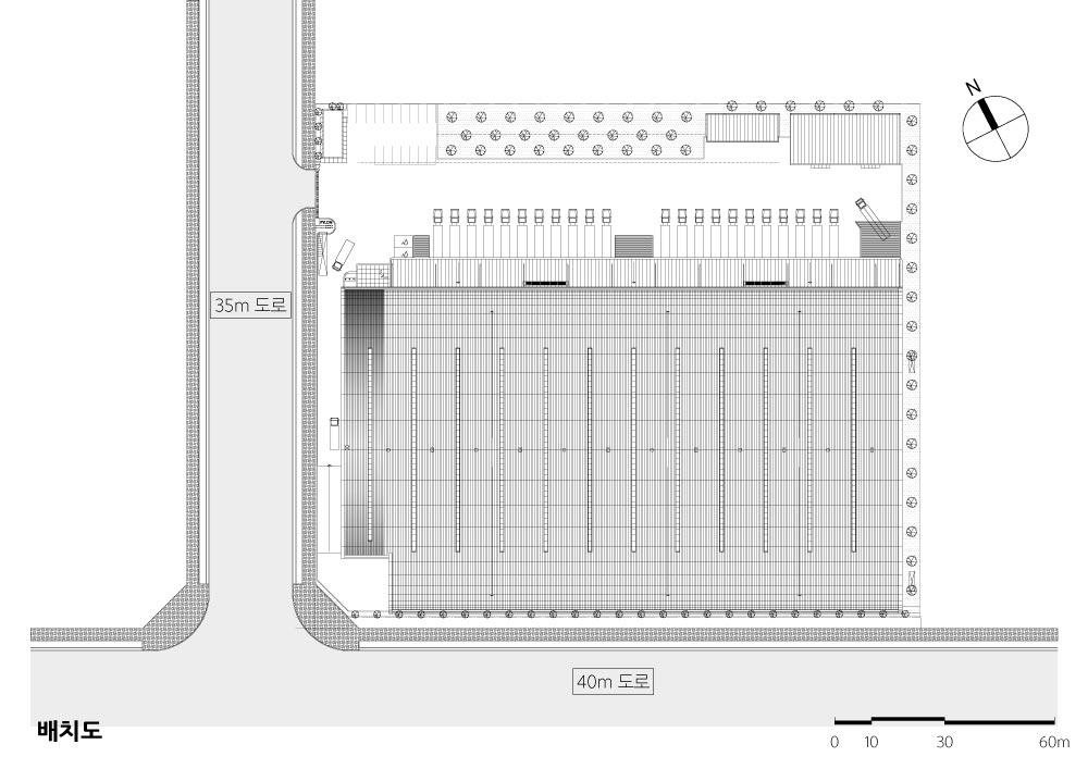 물류센터의 기본 기능에 장애가 없는 170미터 X 65미터 장스팬 대공간을 구성하며, 한편으로는 겉으로 드러나 는 모습에서도 미적인 부분을 놓치지 않도록 했다. 작위적인 디자인이 아닌 정선(精選)되어진 구조의 미가 드 러나도록 의도했다.