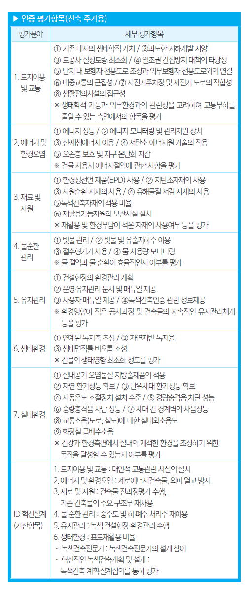 인증평가 및 인증심사는 신축 건축물(주거용·비주거용·단독주택)과 기존건축물(주거용·비주거용·그린리모델링 주거용·그린리모델링 비주거용)로 구분하고, 7개 분야(토지이용 및 교통, 에너지 및 환경오염, 재료 및 자원, 물순환 관리, 유지관리, 생태환경, 실내환경)와 가산항목(ID 혁신설계)에 대하여 세부평가항목별로 심사한다. 인증등급은 최우수(그린1등급), 우수(그린2등급), 우량(그린3등급), 일반(그린4등급) 등 4개 등급으로 분류하여 인증한다.