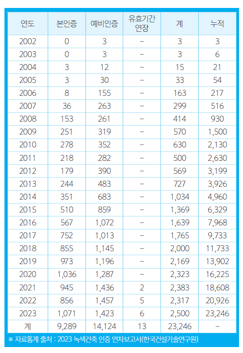 2002년 친환경건축물 인증제도 세부시행지침의 시행에 따라 공동주택을 시작으로 업무용 건축물, 학교시설, 판매시설, 숙박시설 등으로 대상건축물이 점차 확대되었고,「녹색건축물 조성 지원법」이 시행(2013.2월)된 후 2013년 9월부터는 연면적 3천㎡ 이상의 공공건축물에 대한 녹색건축 인증이 의무화됨에 따라 인증실적은 계속 증가하여 인증제도 도입 후 2023년까지 예비인증이 14,124건, 본인증이 9,289건으로 누적 총 23,246건이 인증되었다.