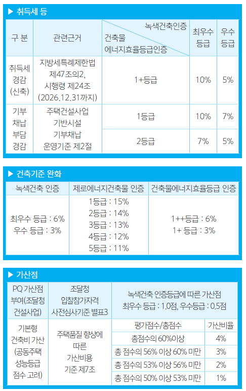 국가 및 지방자치단체에서는 공공건축물을 대상으로 인증취득을 의무화하고, 녹색건축 인증을 취득한 건축물에 대해서는 인증등급에 따라 취득세 경감 및 기부채납 부담경감, 건축기준 완화 등의 인센티브를 부여하고 있다.