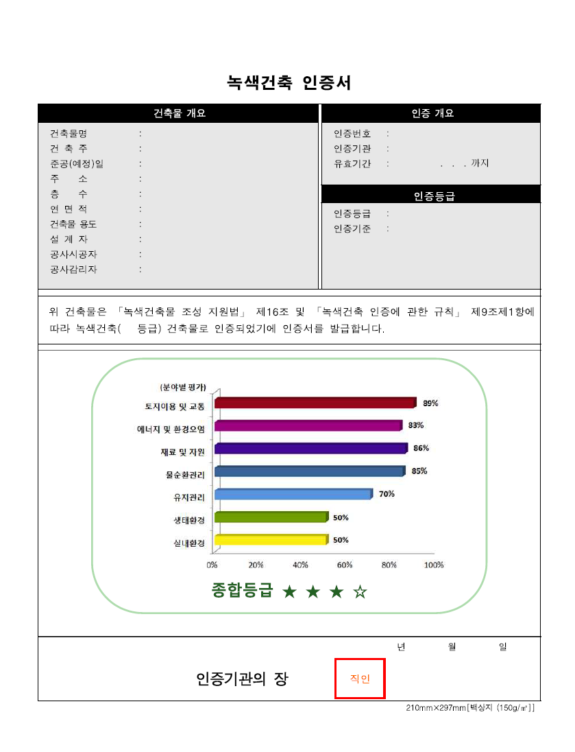 그리고 녹색건축인증(G-Seed : Green Standard for Energy Environmental Design)이란 지속 가능한 개발의 실현을 목표로 인간과 자연이 서로 친화하며 공생할 수 있도록 계획된 건축물의 입지, 자재 및 시공, 유지관리, 폐기 등 건축의 전 생애를 대상으로 환경에 영향을 미치는 요소에 대한 평가를 통해 건축물의 환경 성능을 인증하는 제도를 말한다.
