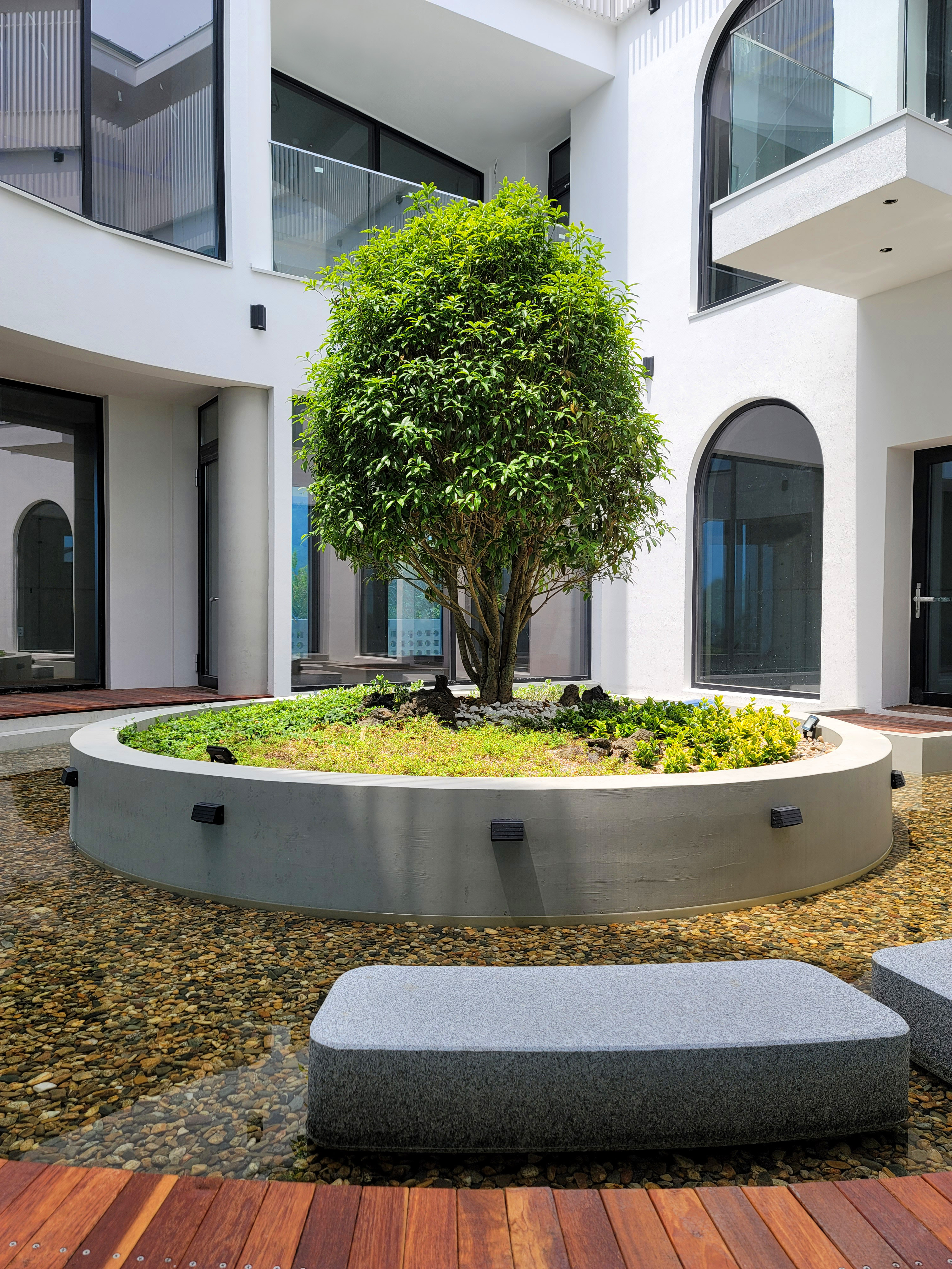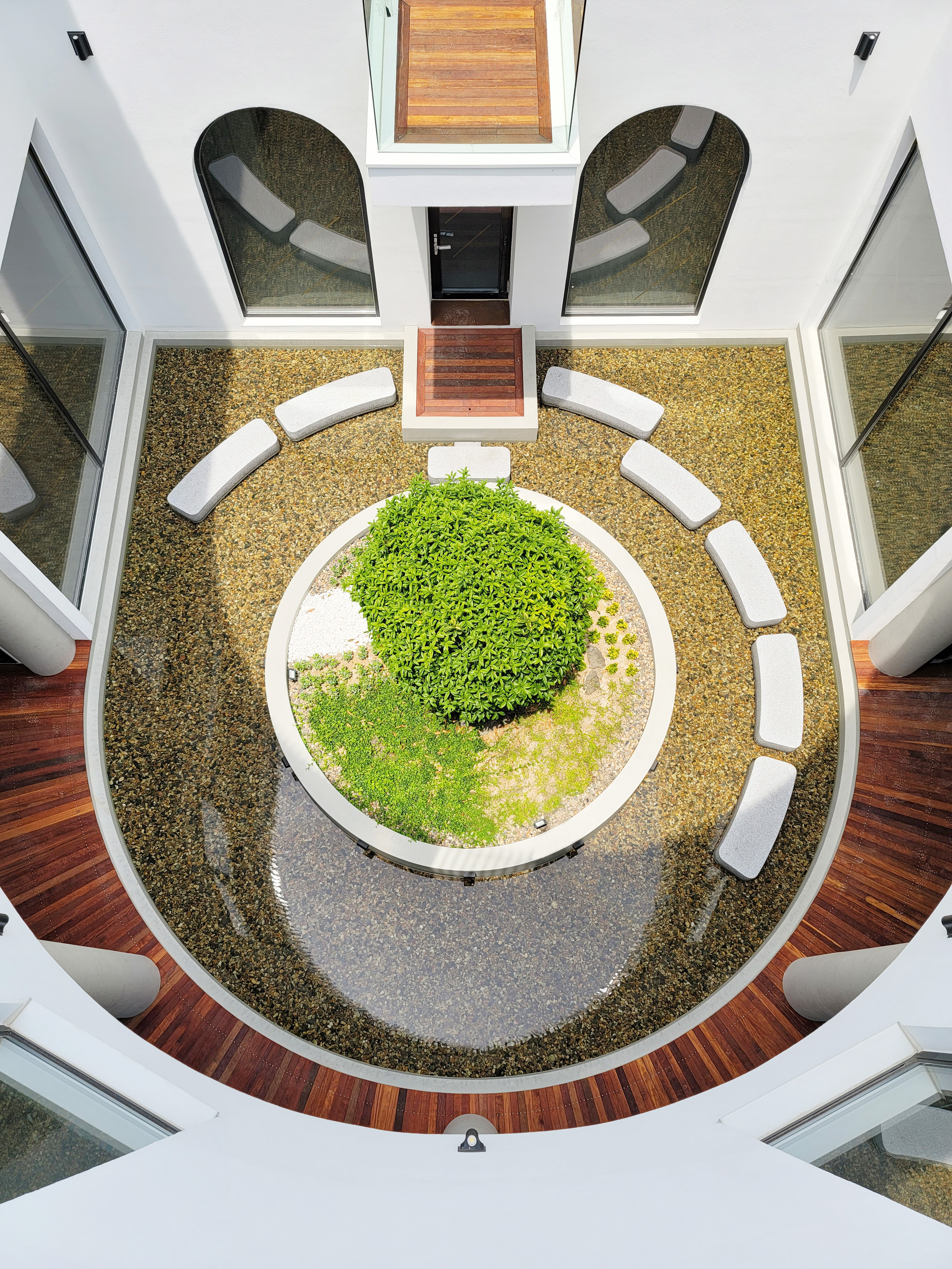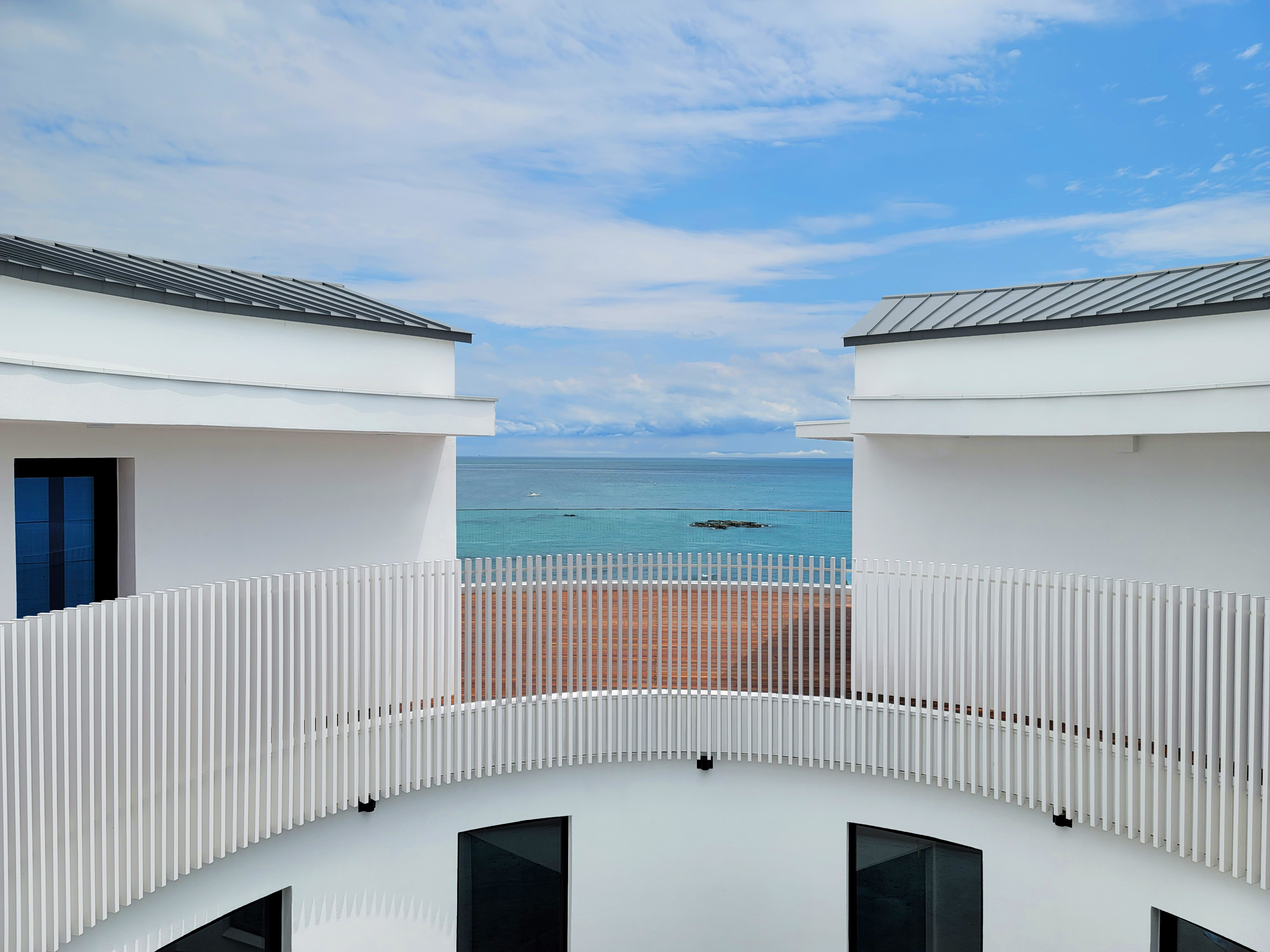 The floor plan is designed to maximize the sea view, with a cylindrical form that gracefully accommodates strong winds, while functional spaces are organized in a rectangular shape. The central part of the building is carved out to create a courtyard open to the sky. This courtyard, featuring a water basin and a single sweet olive tree (Osmanthus fragrans), invites light, rain, and wind, offering a tranquil space that soothes the mind.