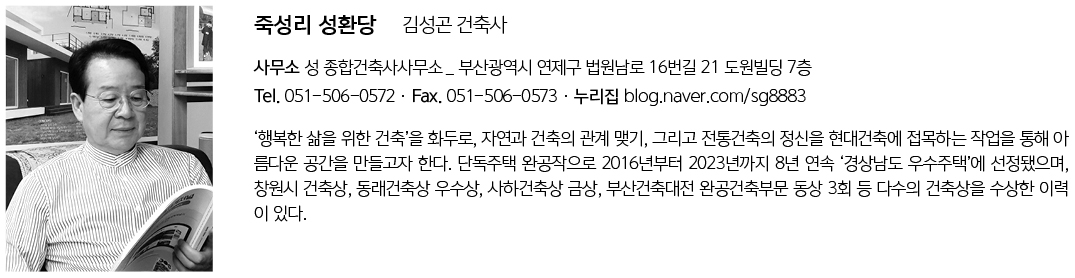| 죽성리 성환당 설계자 | 김성곤 _ 성 종합건축사사무소 건축주 | 주식회사 성환 감리자 | 주식회사 지에스에이건축사사무소 시공사 | 주식회사 세양종합건설 설계팀 | 조민지, 황보나경 설계의도 구현 | 성 종합건축사사무소 대지위치 | 부산광역시 기장군 기장읍 월전해안길 33 주요용도 | 제2종근린생활시설(휴게음식점) 및 단독주택 대지면적 | 933.90㎡ 건축면적 | 403.37㎡ 연면적 | 910.18㎡ 건폐율 | 43.19% 용적률 | 97.46% 규모 | 3F 구조 | 철근콘크리트구조 외부마감재 | 고흥석버너구이, 외단열시스템 스타코 위 엠피실란 마감, 징크 내부마감재 | 제치장콘크리트, 보티치노, 자작나무 합판, 친환경 실크벽지 설계기간 | 2022. 05 – 2022. 10 공사기간 | 2022. 11. - 2024. 06 사진 | 성 종합건축사사무소 구조분야 | 인우구조기술사사무소 기계설비·소방설비·전기설비·정보통신설비분야 | (주)와이케이엔지니어링 |