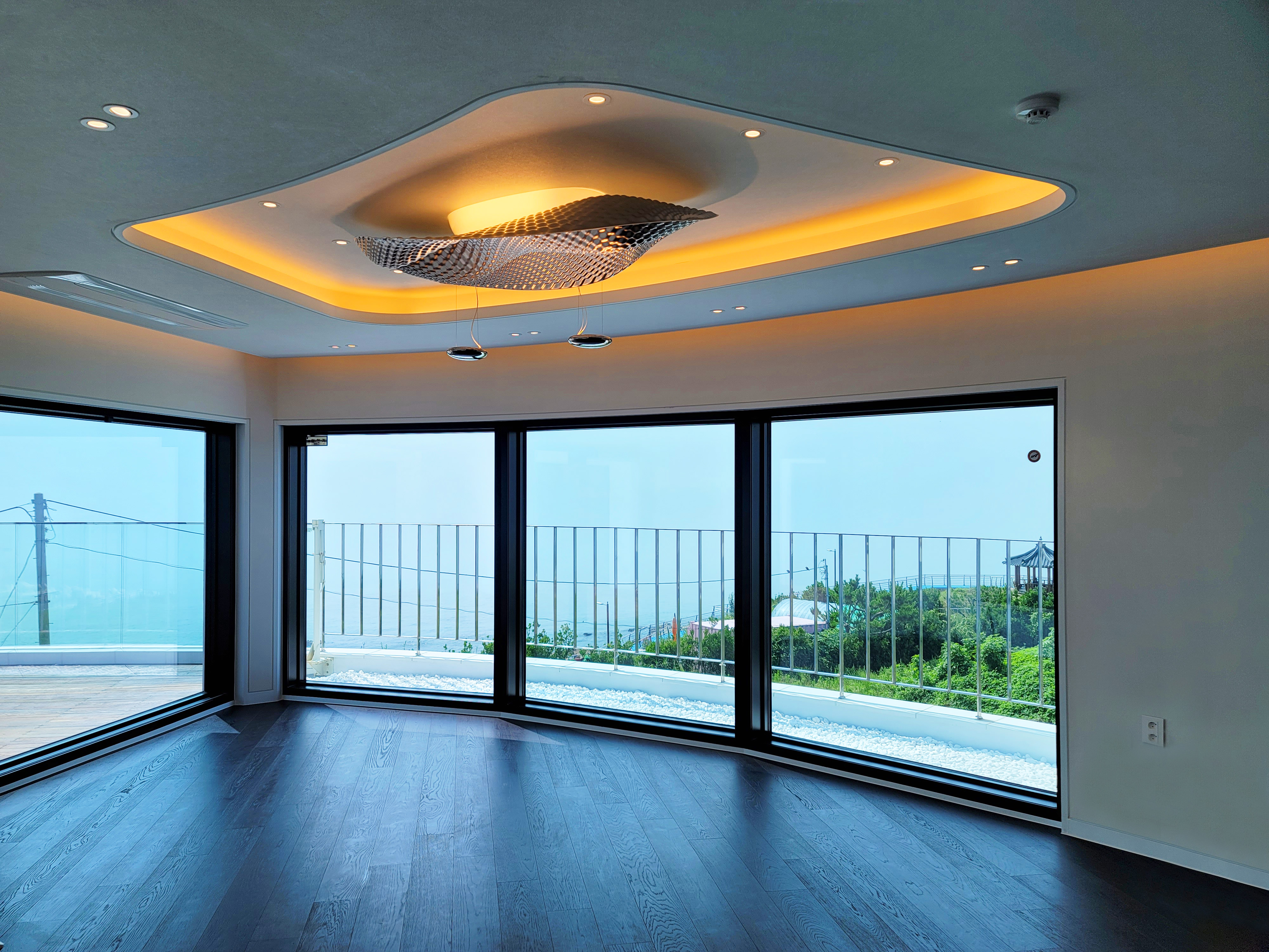 1층의 바다 전망은 일부 언덕으로 가려져 열림과 닫힘이 반반이다. 그러나 2층은 바다와 해안으로 열려있어 전망이 뛰어나다. 이런 지형 조건과 전망을 감안해 1층은 중정을 향한 내부지향형으로, 2층은 탁 트인 바다로 향한 외부지향형이다. 또한, 각 층은 순환 동선의 평면으로 어느 층에서나 중정이나 바다를 바라보며 회유할 수 있다.