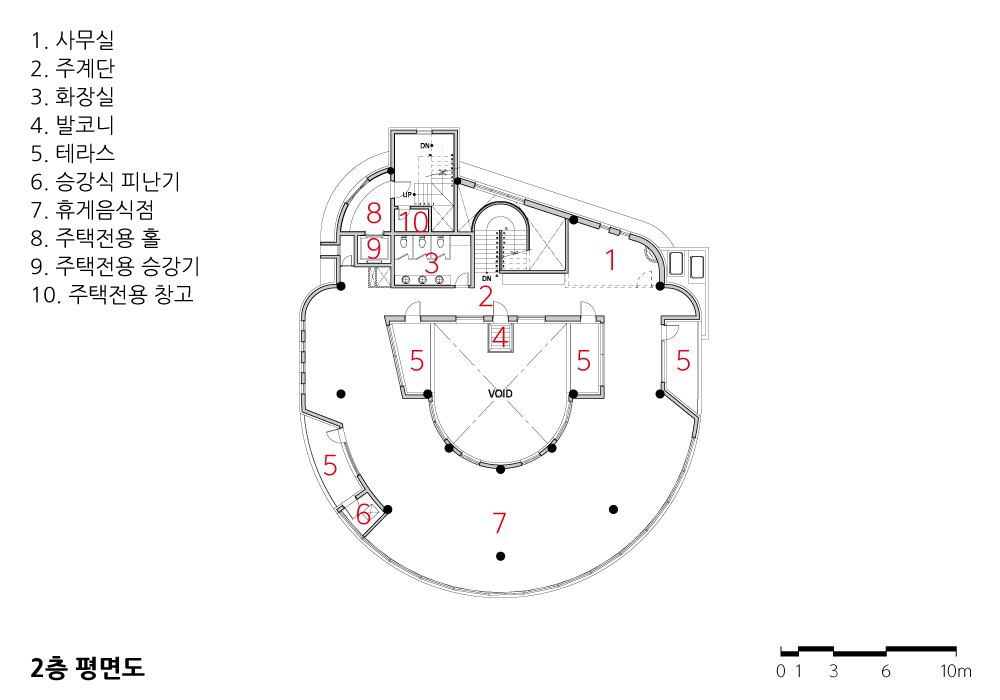 3개 층의 평면은 실린더처럼 층마다 볼륨이 다르다. 특히 1층 주 출입구를 향해 사선으로 나열된 20개의 백색 열주는 물결의 흐름같이 자연스럽고 역동적이다. 또한 3층 주택 중정 외곽선을 따라 순환토록 설치된 베란다의 알루미늄 루버는 촘촘한 조형미로 리듬감을 준다. 외관의 색상은 1층은 짙은 회색, 2~3층은 백색의 무채색으로 대비했다.
