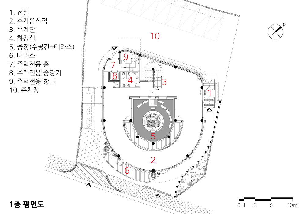 평면은 바다 전망이 한눈에 들어오고 강한 바람에 유연한 원통형에, 단순 기능은 사각형으로 결합하고 그 중심부를 도려내 중정을 만든다. 하늘로 열린 이 중정은, 수반에 담긴 물과 금목서 한 그루에 빛과 비 그리고 바람이 찾아들어 보는 이들의 마음을 편안하게 한다.