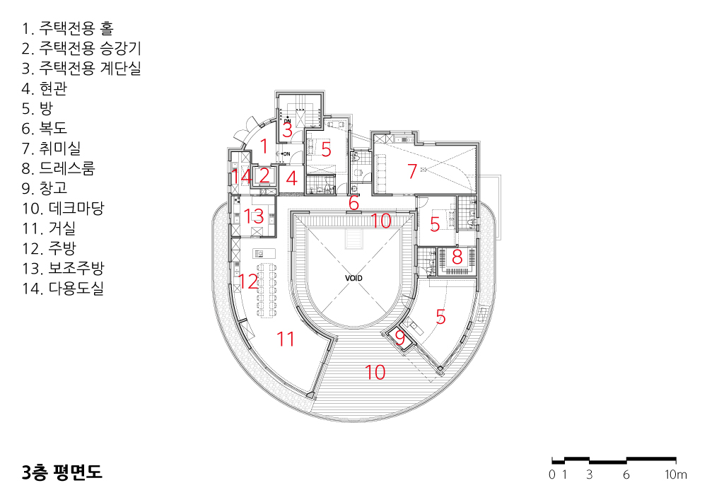 3개 층의 평면은 실린더처럼 층마다 볼륨이 다르다. 특히 1층 주 출입구를 향해 사선으로 나열된 20개의 백색 열주는 물결의 흐름같이 자연스럽고 역동적이다. 또한 3층 주택 중정 외곽선을 따라 순환토록 설치된 베란다의 알루미늄 루버는 촘촘한 조형미로 리듬감을 준다. 외관의 색상은 1층은 짙은 회색, 2~3층은 백색의 무채색으로 대비했다.