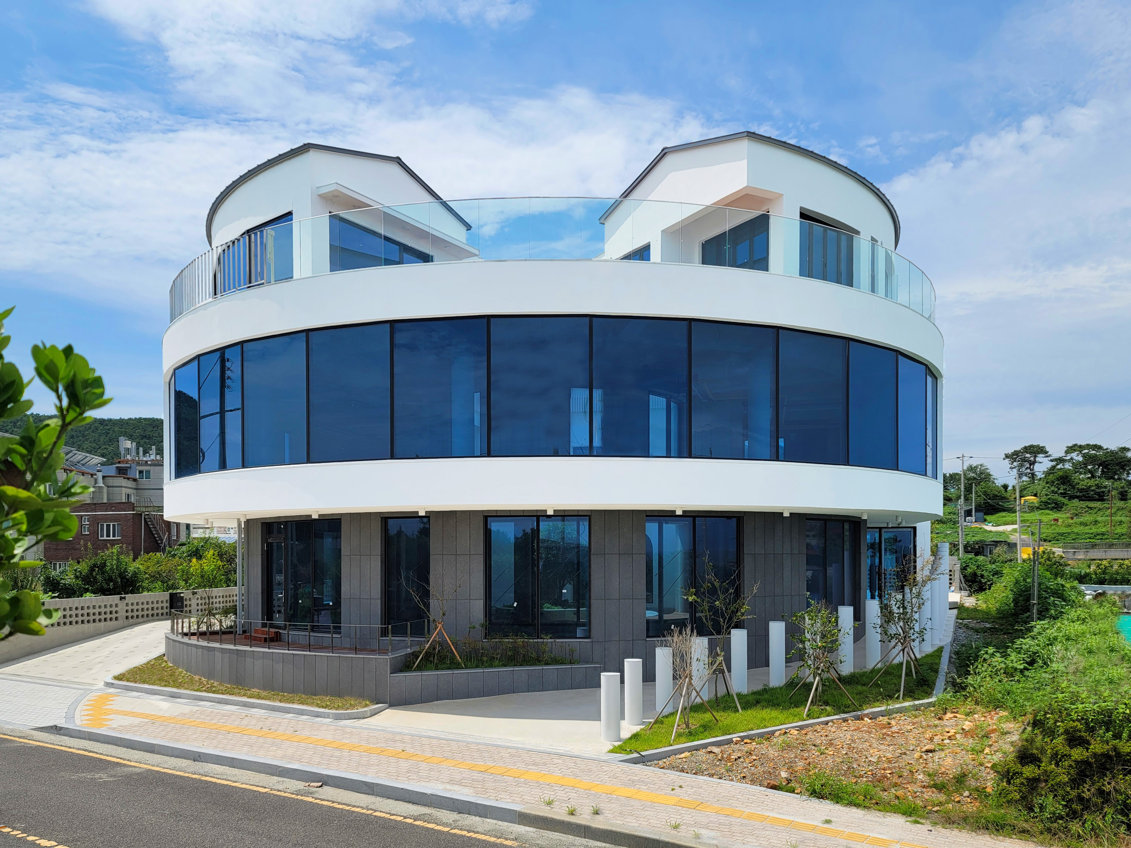 Where can city dwellers, worn out by speed, competition, and the strain of modern life, find a place to relax and heal? The answer is nature. People seek out places where the sea, mountains, land, and sky converge. This building embodies the architectural language that has been consistently pursued over the years: a circular, white structure that stands gently on a green hill against the blue sky. It is a healing space, where the exterior and interior are harmonized to provide a retreat from the stresses of urban life.