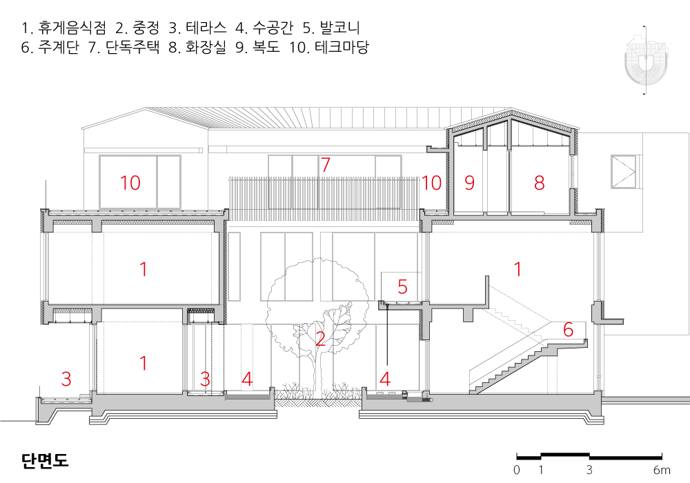 평면 프로그램은 1층과 2층이 근린시설인 휴게음식점, 3층은 단독주택이다. 건물을 최대한 바다 가까이 배치하고 대지 좌측은 차량 진출입구, 우측은 보행자 진입로이며 주차장은 배면이다. 주택은 별도의 전용 엘리베이터와 계단실을 뒀다.