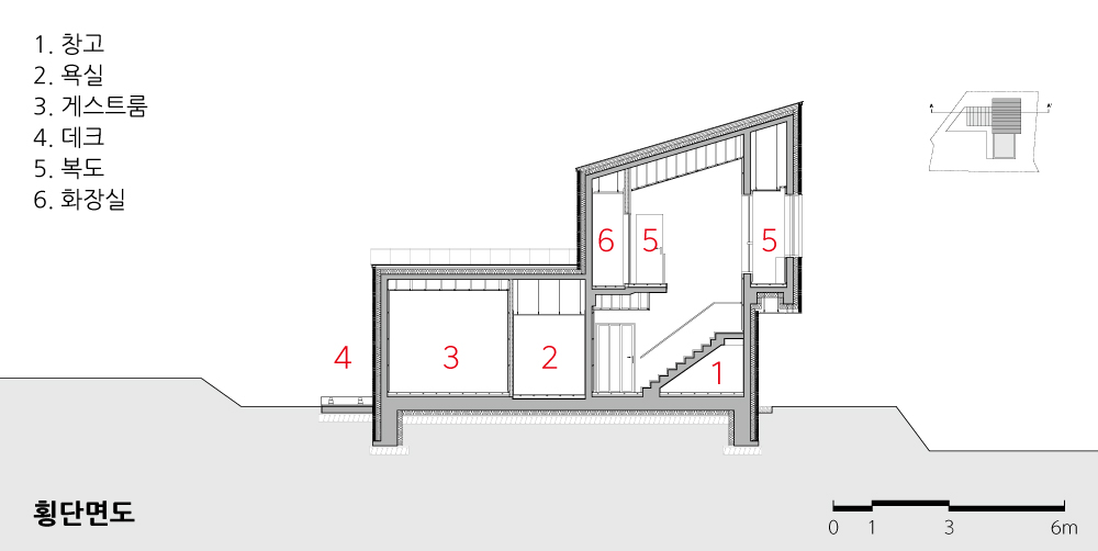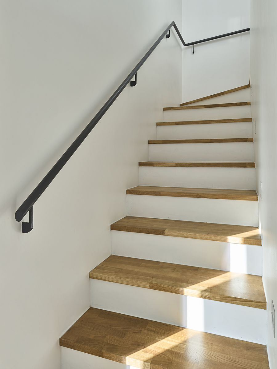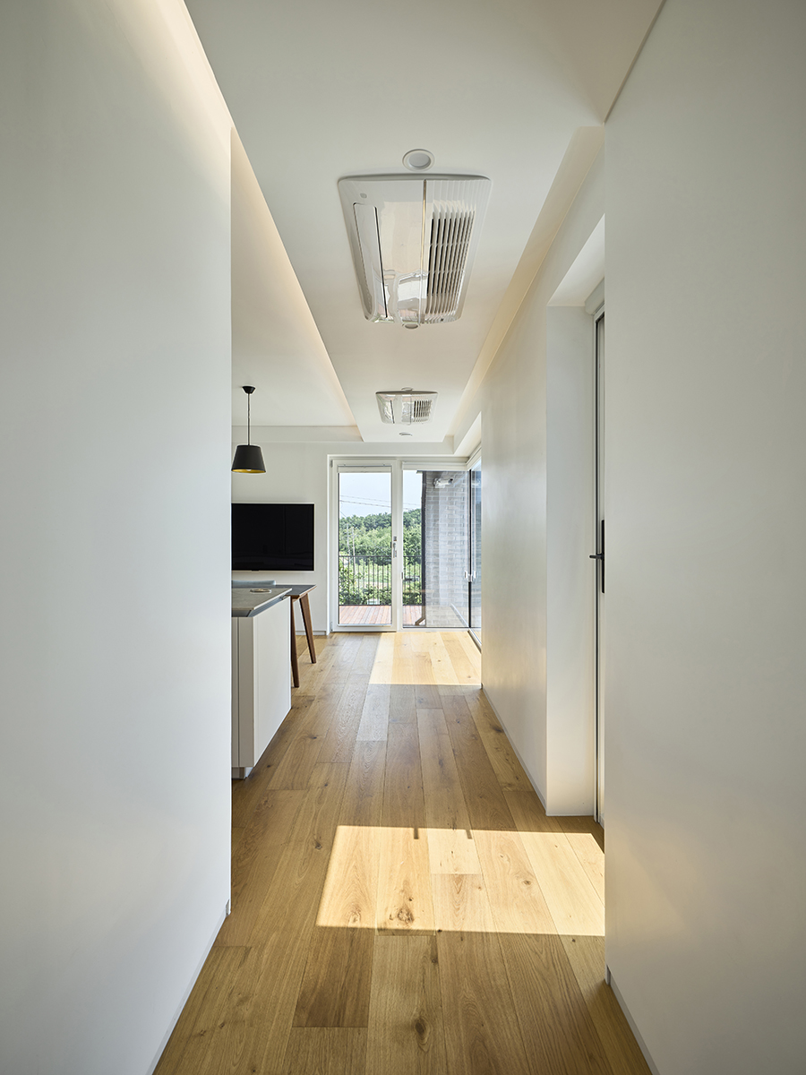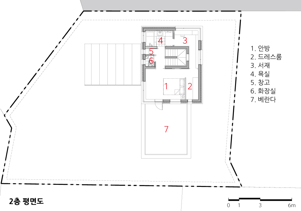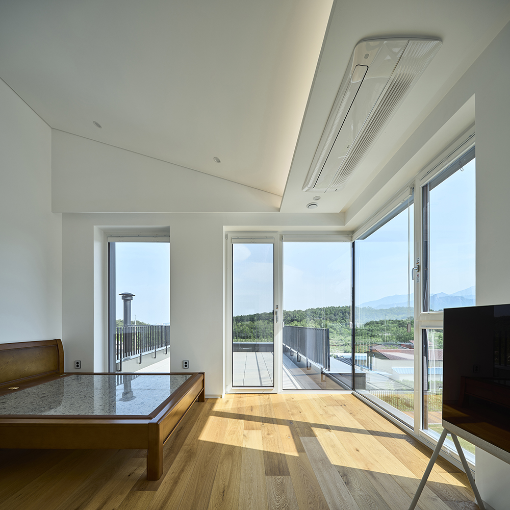 2층은 안방과 서재, 욕실을 배치했고, 계단을 중심으로 각 공간이 연결되어 있다. 이에 따라 각 공간들을 순환할 수 있도록 하여 동선의 효율과 공간의 연속성을 경험하도록 계획했다. 또한 공간을 이동하며 보이는 곳에 적절히 창을 배치해 동선 상에서 자연을 느끼고 시선의 끝에서 내부 공간이 외부로 확장될 수 있도록 의도했다. 서재에서는 마을의 전경과 멀리 바다까지 바라볼 수 있게 하고, 안방에서는 옥상테라스를 이용해 1층에서 보는 조망과는 다른 자연으로 둘러싸인 파노라마 뷰를 선사한다.