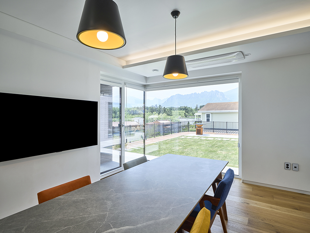 As the design process unfolded, a key concern was how to connect with nature in a countryside home that serves as a retreat from the complex daily life in Seoul. To maximize the experience of nature available from the site, windows were strategically placed in key areas, with corner windows used to enhance the views. Upon entering the bright, welcoming entrance and stepping into the living room, one is greeted by a panoramic view of the yard and the distant Seoraksan. The common areas, including the living room, dining room, kitchen, and utility room, are located on the first floor. A porch and deck facing the yard facilitate outdoor activities that allow the residents to fully engage with nature.