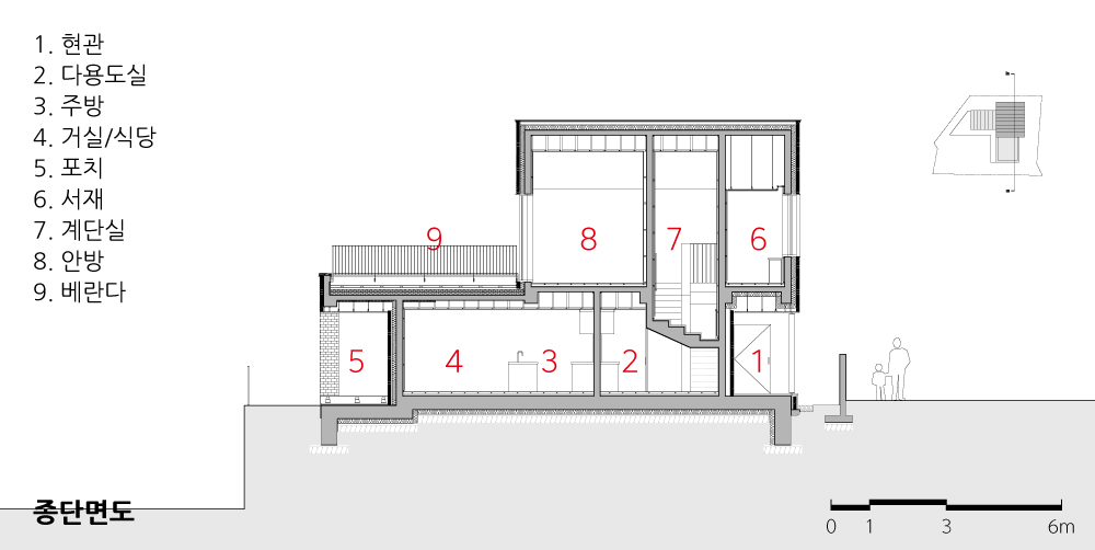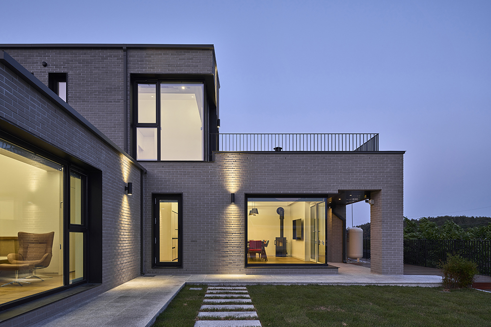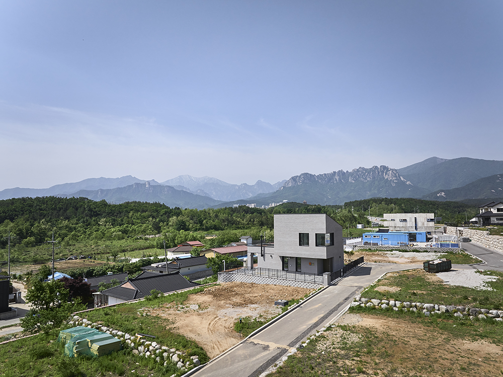 대지는 주택용지로 개발된 마을 안의 필지로 동·서측의 인접대지와 1.5미터 레벨로 구분돼 있었고, 남쪽 인접대지는 3미터 정도 낮아 막힘없이 열린 조망을 가지고 있었다. 북쪽 도로에서 진입해 주차하고 집으로 진입하는 과정을 생각하며 배치를 고민했다. 조망과 프라이버시. 이 상반된 요구사항에 대응하기 위해 대지의 조망, 프라이버시, 진입 동선 등을 고려해 ‘ㄴ’자 형태로 북측 도로에는 건물로 마주하고 남서쪽의 설악산 조망을 향해 열리는 배치로 마당을 안으며 자리 잡았다.