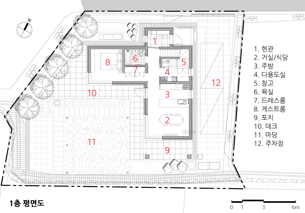 The site, located within a residentially developed village, is separated from adjacent plots by a 1.5-meter level difference on the east and west sides, while the southern adjacent plot is about 3 meters lower, offering an uninterrupted view. Considering the entry sequence from the northern road—parking and then entering the house—the design was carefully planned. To address the conflicting requirements of view and privacy, the layout took into account the site’s views, privacy needs, and access paths. The house was designed in an “L” shape, with the building facing the northern road and opening towards the southwest, embracing the yard while directing the view towards Seoraksan.