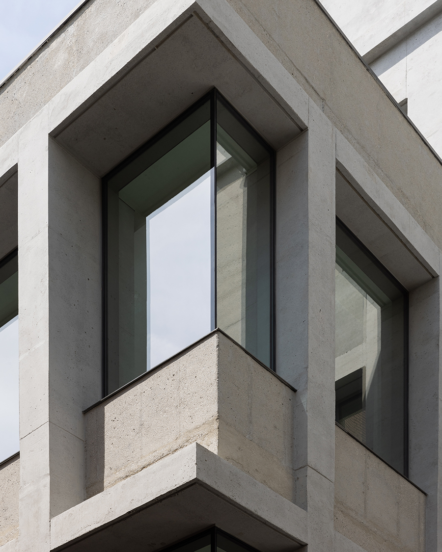 A monolithic block of exposed concrete reveals the material's inherent properties, serving simultaneously as structure, form, and atmosphere. Amidst the increasingly complex materials of the bustling commercial streets, this building stands out by using a single material to create a unified mass. The smooth surfaces of the grid lines and the rough, chipped textures are harmoniously integrated within this single material, showcasing a balanced interplay of textures.