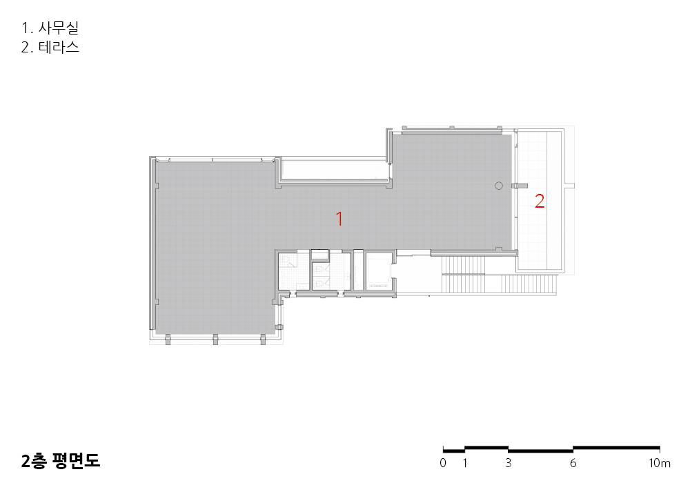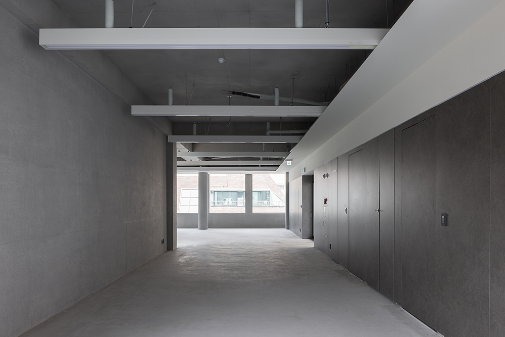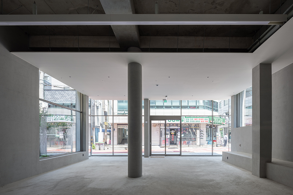 노출 콘크리트로 이루어진 하나의 덩어리는 재료의 물성을 드러내고, 그 자체로서 구조이며 형식이고 분위기가 된다. 복잡한 상업가로에서, 점점 더 복잡해지는 재료들 사이에서 하나의 재료를 통해 덩어리로 구성한다. 격자선의 매끈한 면과 치핑된 거친 면으로, 하나의 재료 속에 각각의 질감으로 조화롭게 구성된다.