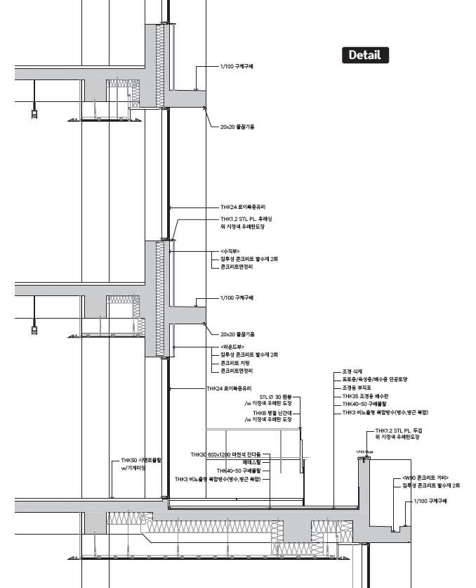 우리는 건축물의 구조적인 것(공간)과 비구조적인 것(파사드) 사이에서 구축 형식(질서)을 통해 유연한 입체적 파사드(facade)를 계획한다. 공간과 구조, 입면의 관계는 연속적이고 또 개별적인 성격으로 본다.