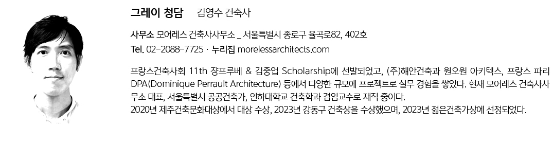 | 그레이 청담 설계자 | 김영수 _ 모어레스 건축사사무소 건축주 | 주식회사 전피엠씨, (주)꿈아이 감리자 | 김영수 _ 모어레스 건축사사무소 시공사 | (주)공정건설 설계팀 | 엄베드로, 양원중, 송채윤 설계의도 구현 | 모어레스 건축사사무소 대지위치 | 서울특별시 강남구 선릉로148길 12 주요용도 | 제2종근린생활시설 대지면적 | 510.20㎡ 건축면적 | 304.71㎡ 연면적 | 1,376.45㎡ 건폐율 | 59.72% 용적률 | 197.98% 규모 | B1F - 6F 구조 | 철근콘크리트구조 외부마감재 | 노출콘크리트 내부마감재 | 노출콘크리트 설계기간 | 2022. 04 - 2022. 08 공사기간 | 2022. 11 - 2024. 06 사진 | 조엘 모리츠 구조분야 | 이든구조컨설턴트 기계설비분야 | (주)이래엠이씨 전기·소방분야 | (주)성지이앤씨 |
