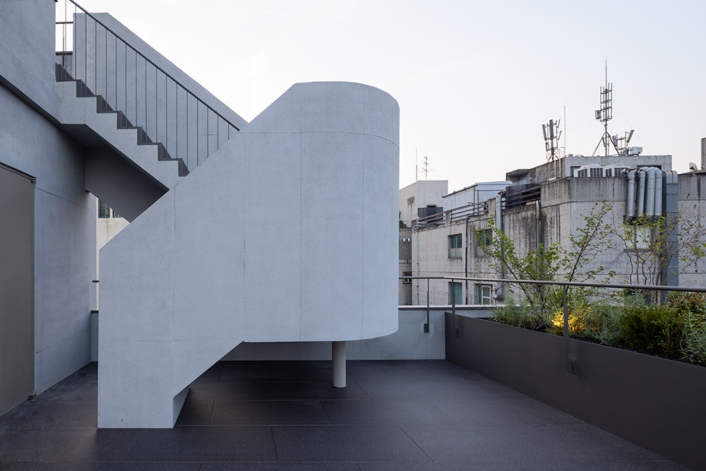 노출 콘크리트로 이루어진 하나의 덩어리는 재료의 물성을 드러내고, 그 자체로서 구조이며 형식이고 분위기가 된다. 복잡한 상업가로에서, 점점 더 복잡해지는 재료들 사이에서 하나의 재료를 통해 덩어리로 구성한다. 격자선의 매끈한 면과 치핑된 거친 면으로, 하나의 재료 속에 각각의 질감으로 조화롭게 구성된다.
