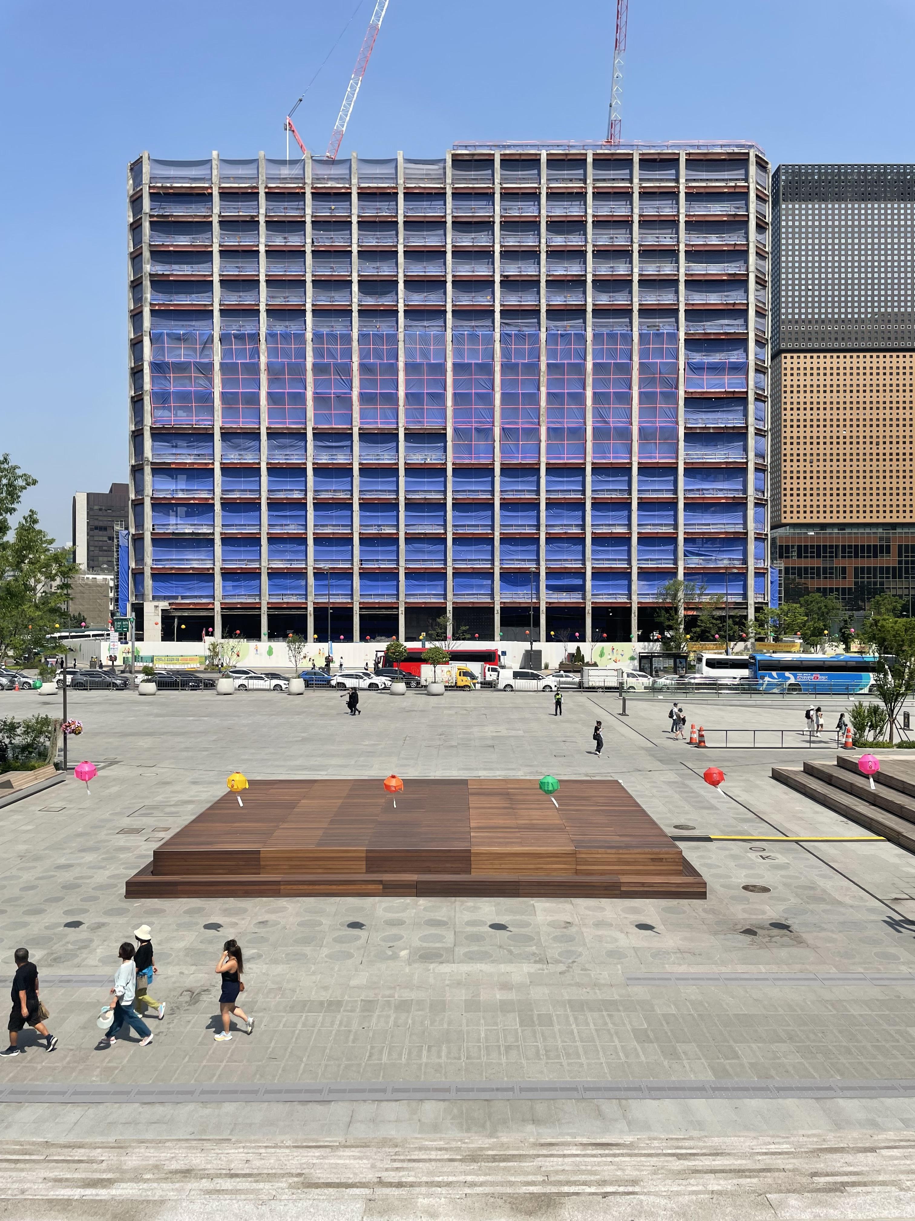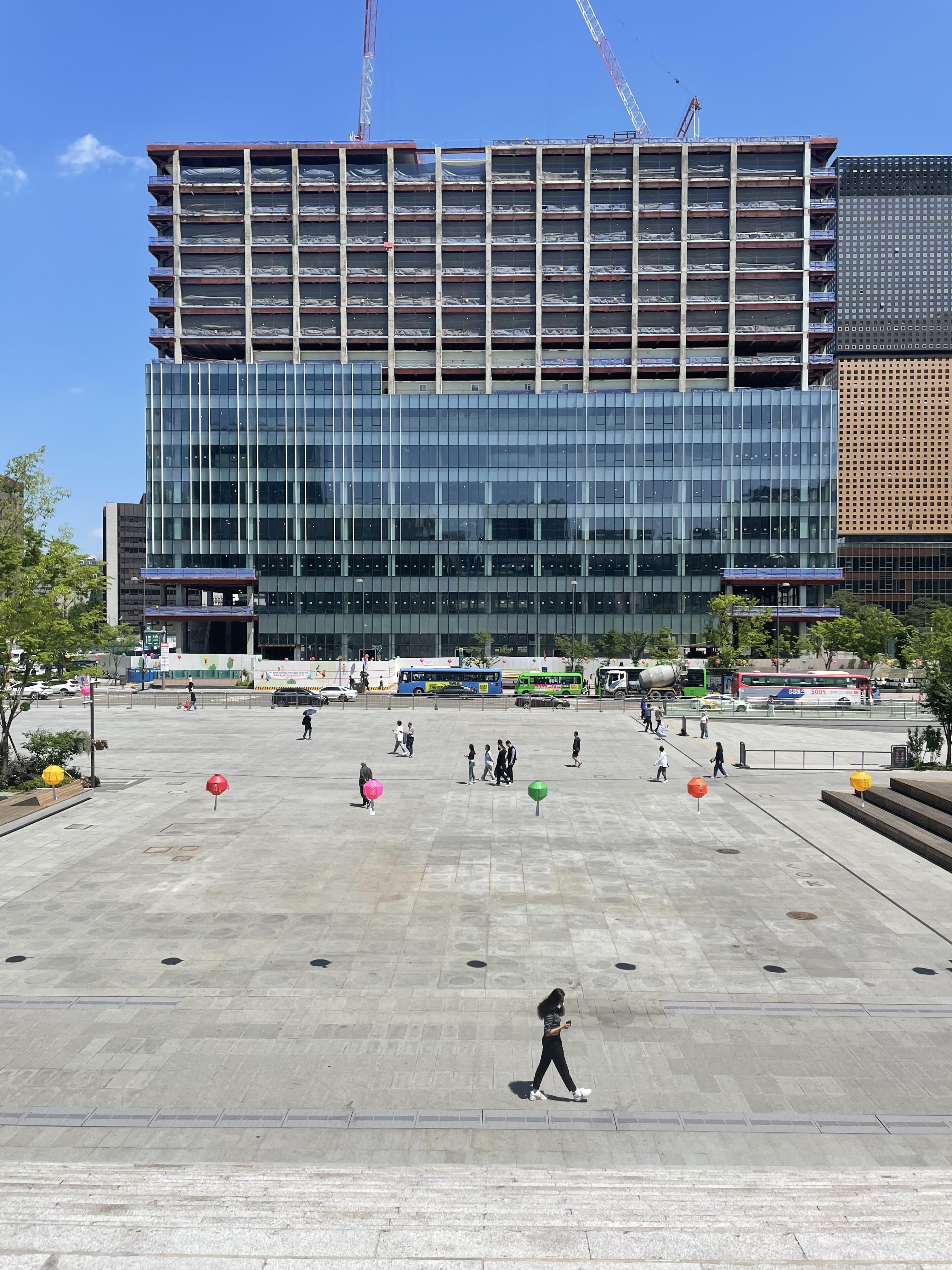 광화문 광장의 청진동 방향에는 역사적인 건물들이 연달아 있다. 교보생명빌딩, 케이티빌딩, 미국대사관, 대한민국역사박물관이다. 나는 케이티빌딩을 보면 언제나 한숨이 나왔다.<사진 7> 어떻게 저렇게 멋대가리 없이 디자인할 수 있을까? 건물은 세로보다 가로의 길이가 더 길어서 마치 옆으로 퍼진 듯한 둔중한 인상을 준다. 둔중한 인상을 더욱 강화하는 요소는 작은 창문과 넓은 석재 마감이다. 19세기 마천루도 이보다는 더 세련되었다. 어느 날 이 건물의 표면이 가림막으로 뒤덮였다.<사진 8> 마치 크리스토의 포장 예술 같다. 앞으로 바뀔 외관을 홍보하는 가림막이었다. 커튼을 로봇의 손이 젖히는 디자인은 1990년대 컴퓨터 그래픽을 보는 듯 촌스럽기 그지없다. 본격적인 공사가 시작되었는지 1990년대의 촌스런 가림막이 사라졌다. 그러자 건물의 뼈대가 드러났다.<사진 9> 가로 보와 세로 기둥의 규칙적으로 교차하는 수학적 질서가 드러나니 가림막을 보는 것보다 나았다. 공사는 아주 천천히 진행되었는데, 어느 날부터 유리 커튼월이 부착되기 시작했다.<사진 10> 최근에 저층부의 모서리만 빼고 유리 마감재가 전부 부착되었다.<사진 11> 그러자 이 오래된 건물의 나이가 급격하게 젊어졌다. 똑같은 비례지만, 둔중한 느낌이 사라졌다. 미스 반 데어 로에가 말한 매스(mass)의 건축이 볼륨(volume)의 건축으로 드라마틱하게 바뀌는 걸 이보다 더 명징하게 보여주는 사례는 없을 것이다.