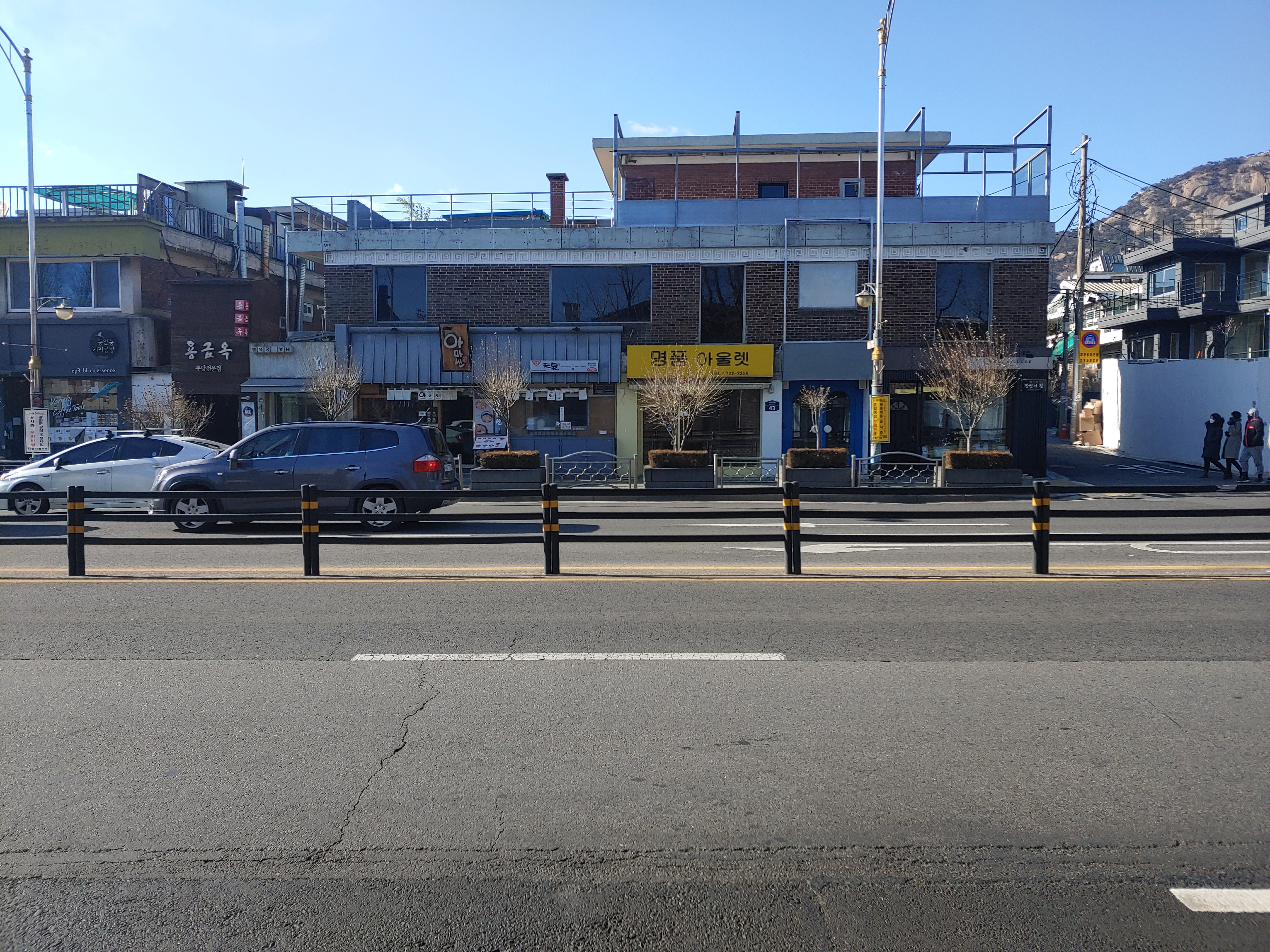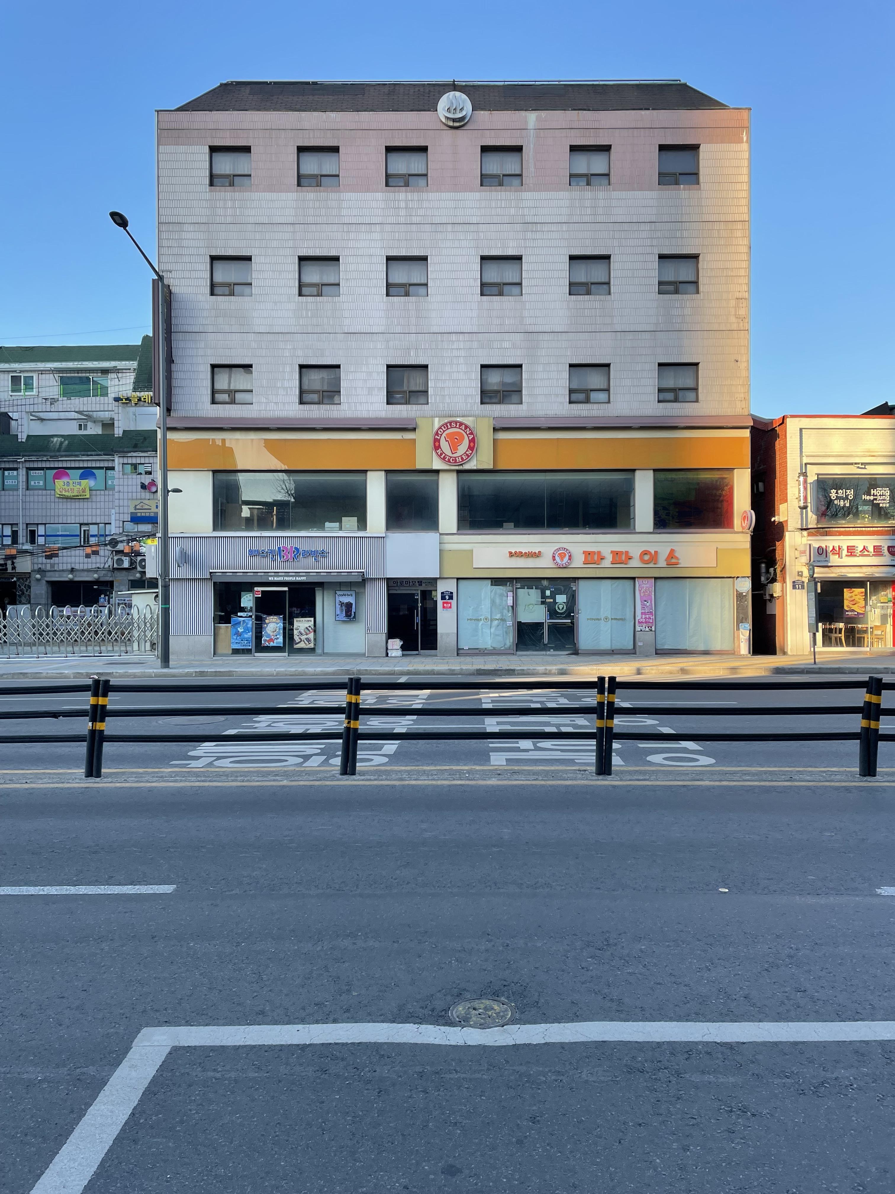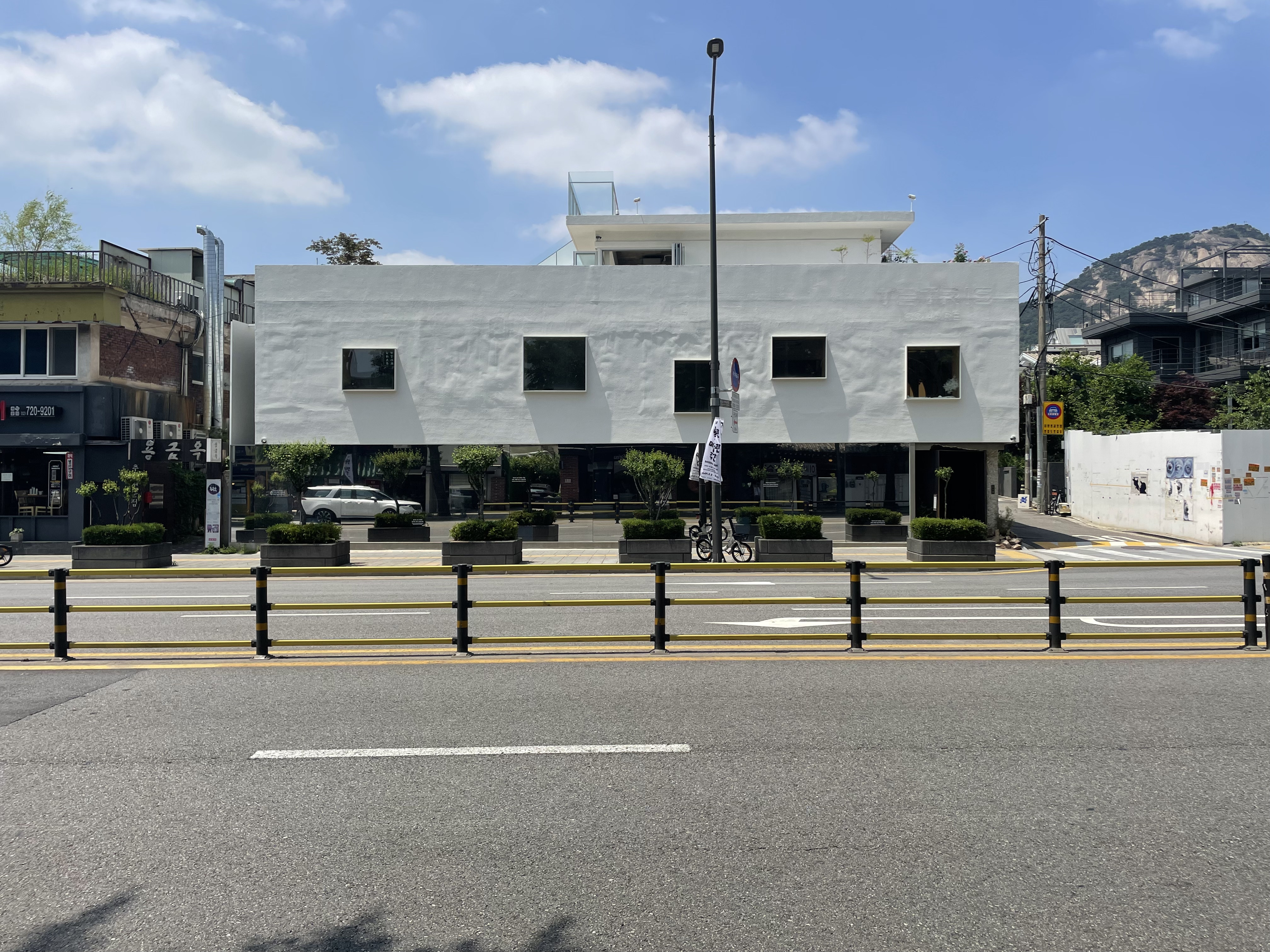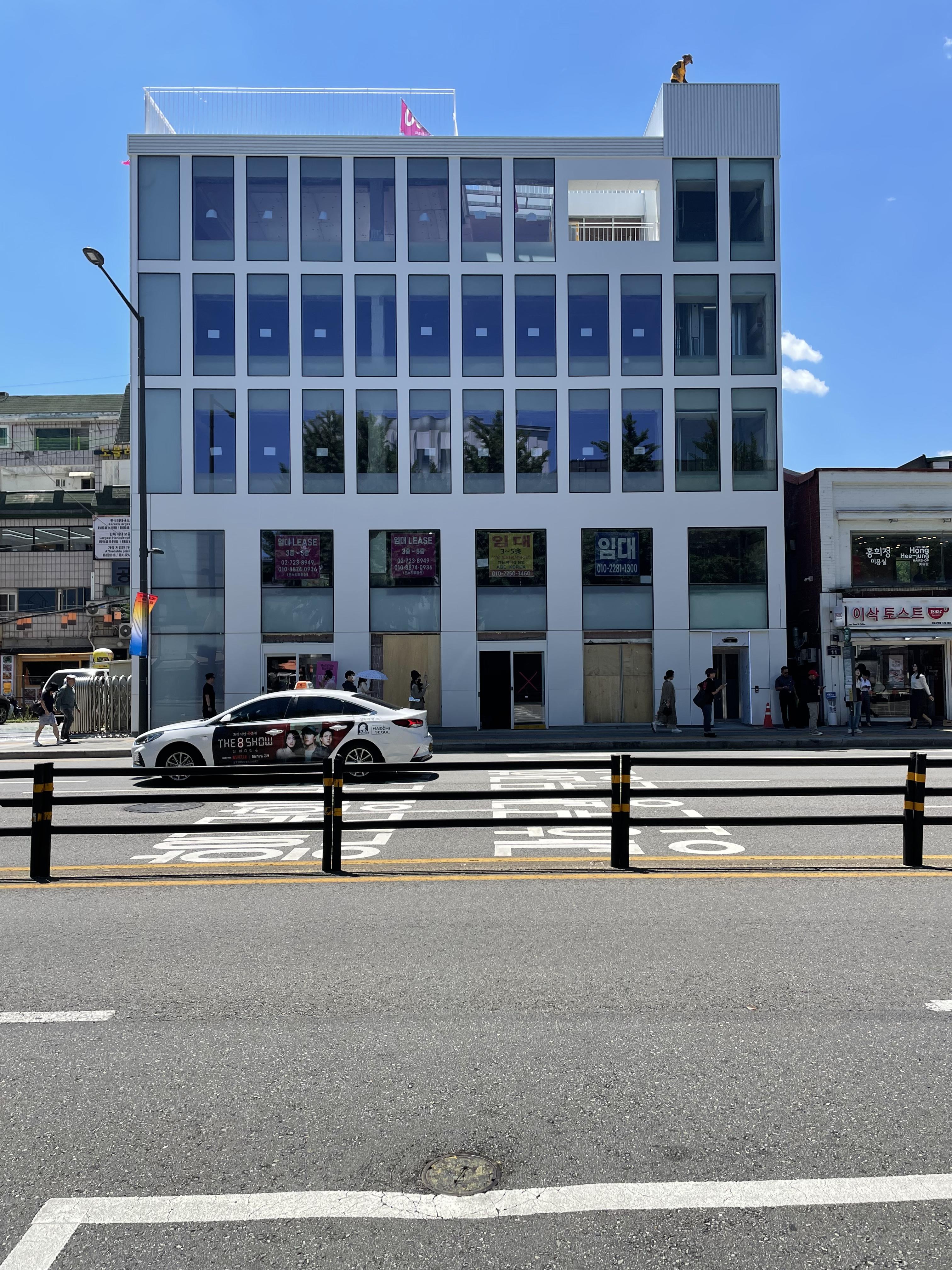 원래 1층에는 명품 아웃렛과 일식 주점이, 2층에는 카페가 있는 건물의 변신도 놀랍다. 원래 건물의 2층 벽은 아주 오래된 짙은 적벽돌로 마감되어 있었다.<사진 5> 어느 날 공사가 시작되었다. 2층은 온통 흰색 벽으로 마감되어 전반적으로 불규칙한 창문과 흰색 배경의 구성 작품이 되었다.<사진 6> 1층은 통유리다. 아주 단순해졌다. 이곳은 현재 베이커리 카페가 되어 젊은이들에게 큰 인기를 끄는 곳이 되었다. 파사드의 구성 요소를 줄일수록 건물은 훨씬 세련돼진다.