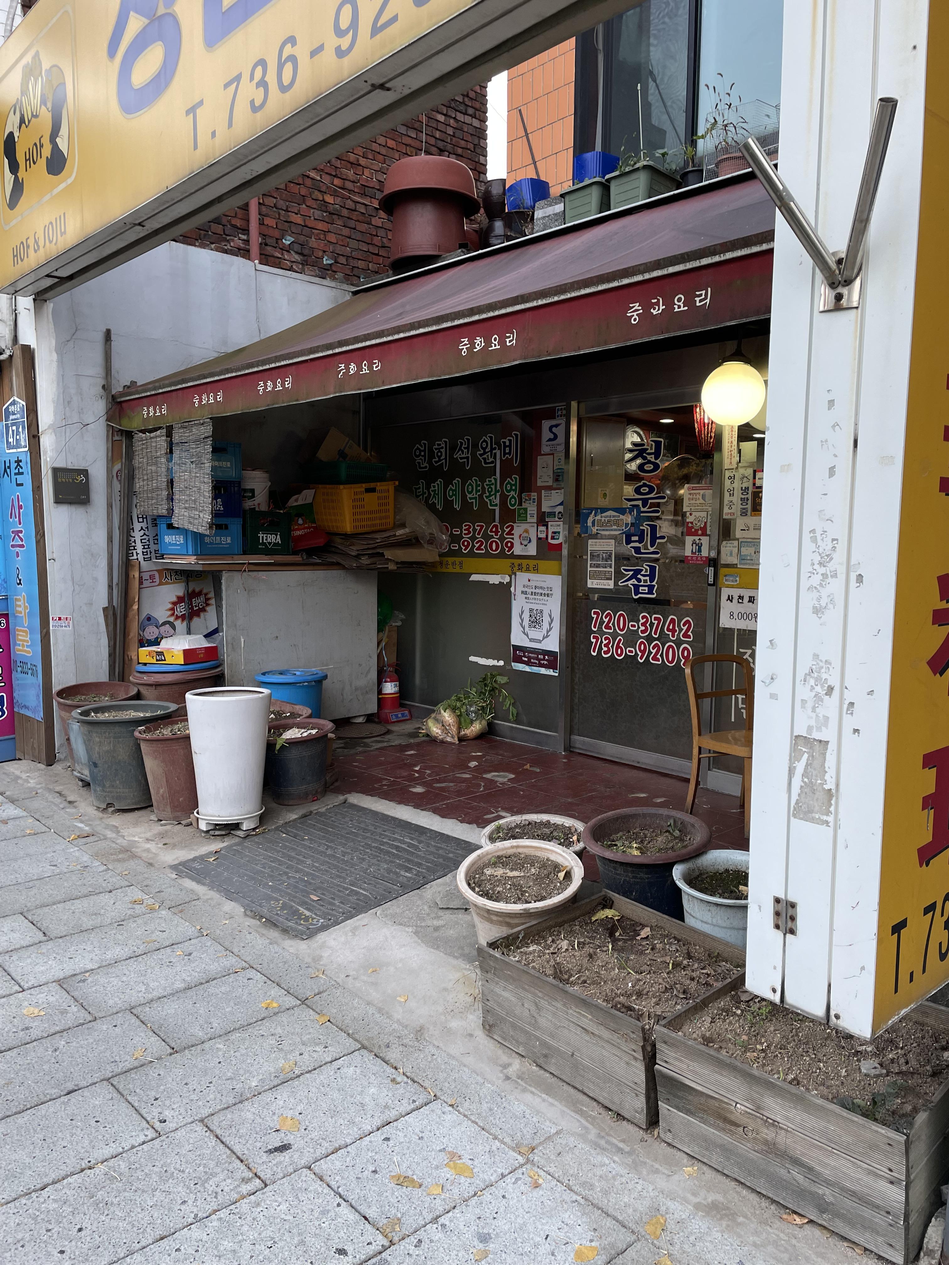 통인시장에서 조금 떨어진 곳에 청운반점이라는 중국집이 있었다.<사진 1> 이 중국집은 영화 <수상한 그녀>의 촬영 장소였다. <수상한 그녀>는 800만 명 이상이 본 흥행작이어서 이 중국집이 그 덕을 볼만했다. 청운반점은 영화 포스터를 붙여서 자랑했지만, 영업에는 전혀 도움이 안 되는 것처럼 보였다. 이 식당은 바로 코앞에 버스 정류장이 있는데도 손님이 있는 걸 잘 보지 못했다. 입구는 너무나 지저분해서 도무지 들어가고 싶은 마음이 들지 않는 곳이었다. 차양은 오염되었고, 입구에 놓은 화분들은 방치되는 것처럼 보였다. 술 박스 여러 개가 입구 옆쪽에 쌓여 있어 보기 흉하다. 관리가 안 되는 모습이어서 오히려 손님들을 쫓아내면 쫓아냈지 환영하는 분위기가 도무지 보이지 않는다. 서촌에 사는 나는 경복궁역으로 걸어갈 때 이곳을 수도 없이 지나쳤지만 한 번도 들어간 본 적이 없다.