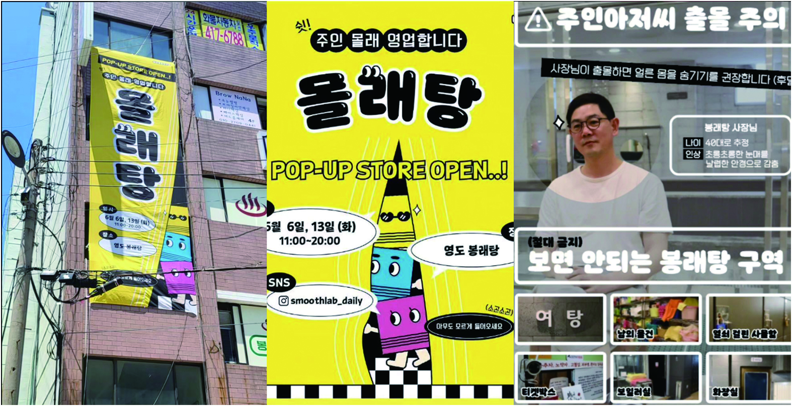 부산 영도구에 있는 오래된 목욕탕인 봉래탕 건물에 알쏭달쏭한 문장을 쓴 플래카드가 내걸렸다. 목욕탕 정기 휴일에 열리는 팝업스토어 이벤트를 광고하는 현수막이었다. 2023년 6월 두 차례 진행된 ‘몰래탕’ 팝업 스토어는 매끈목욕연구소와 봉래탕의 협업 행사였다. 1986년 문을 연 봉래탕은 창업자의 아들이 이어받아 2대째 운영하고 있는 38년이나 된 동네 목욕탕이다. 매끈목욕연구소는 도시를 디자인하고 브랜드화해 가치를 부여하는 부산의 도시 브랜딩 회사 ‘싸이트브랜딩’의 사내 프로젝트 그룹이다. 이 연구소는 부산의 동네 목욕탕이 사라지는 것을 막기 위해 오래된 목욕탕 건물을 3D 스캔해서 내부 구조를 데이터로 남기는 일을 했고 목욕탕에 대한 다큐멘터리를 제작하기도 했다. 또 매달 목욕탕 전문 잡지인 <집앞목욕탕>을 발행하고 있다.