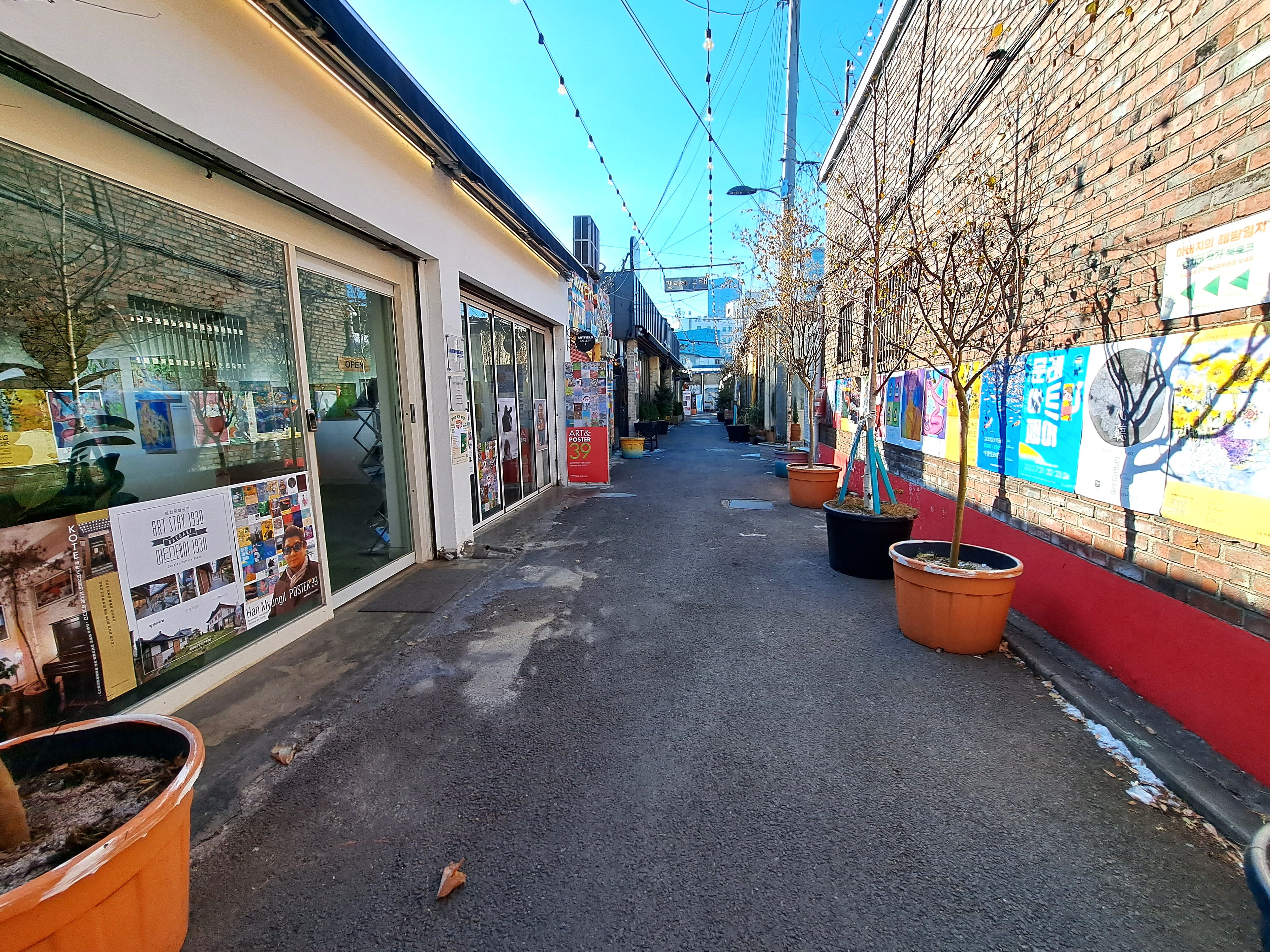 우체국을 마주 보고 왼편 골목으로 접어든다. 비좁으나 정갈하고 차분하다. 방송을 탔음직한 오래된 식당 옆으로 앙증맞은 아트 갤러리가 보인다. 골목엔 지난 계절에 열린 여러 행사 홍보지가 붙어있다. 옆으로 제법 규모를 갖춘 또 다른 갤러리가 보인다. 문래동 저녁을 밝힌다는 전등이 공중에 매달려 흔들흔들 재잘댄다. 둥근 화분을 차지한 키 작은 나무가 바뀌는 계절을 실감 나게 한다.
