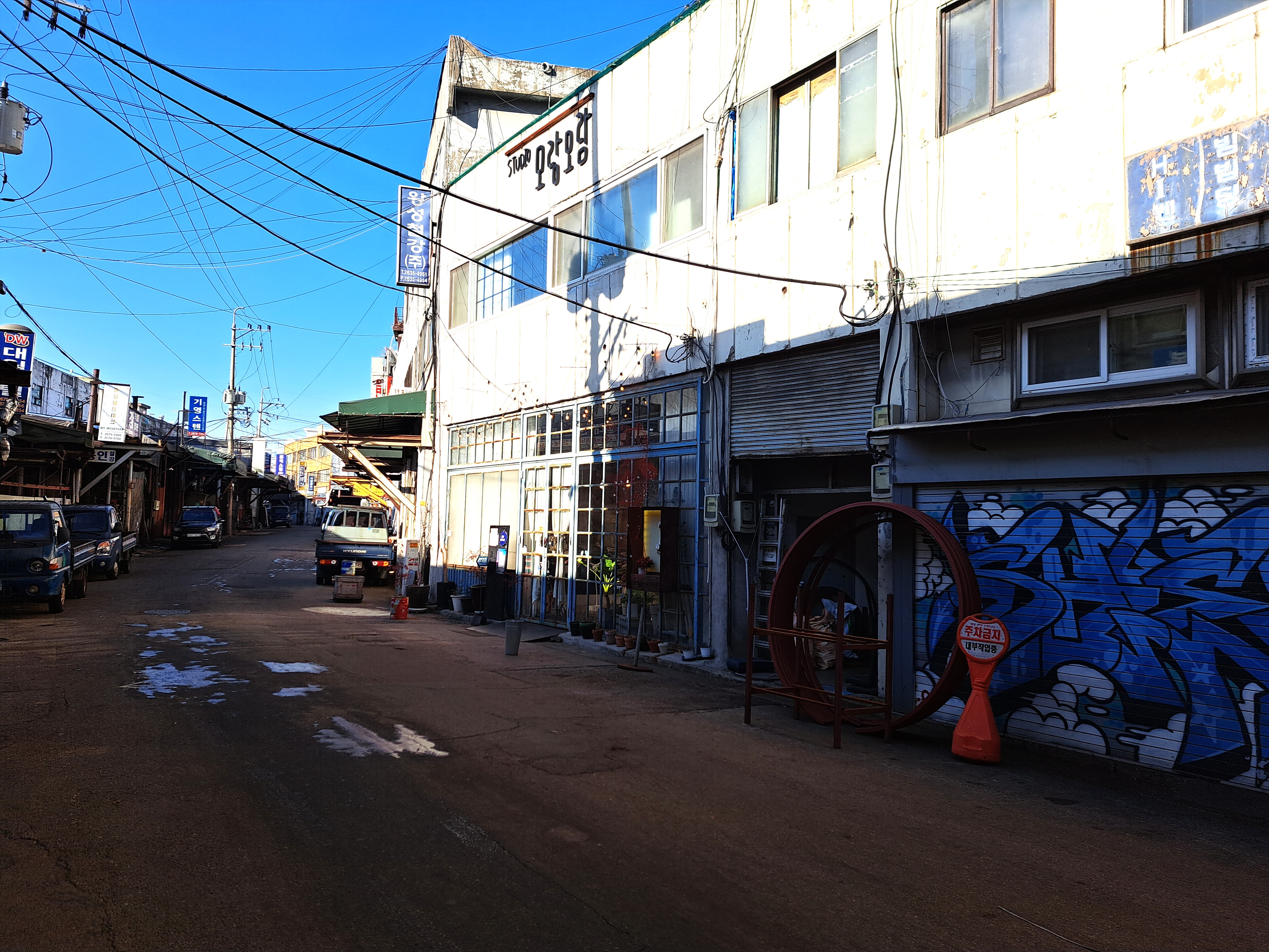 골목 안 작은 공장이나 점포, 주택이었음이 분명해 보이는 집들의 용도가 바뀌는 중이다. 음식점과 카페, 주점이 자리하면서 공간기능 전이 현상이 일어나고 있었다. 남아있는 공장과 점포가 대낮을 지배한다면, 젊은이 취향으로 전이한 집들은 분명 저녁에 더 활발할 터이다. 이렇게 바뀌어 간다면 이곳에도 젠트리피케이션 바람이 불어올까? 아니면 공장들이 자리를 지키며 이를 막아낼까? 허름한 벽 곳곳에 벽화가 그려져 있다. 이곳에 둥지를 튼 예술가의 흔적이다.