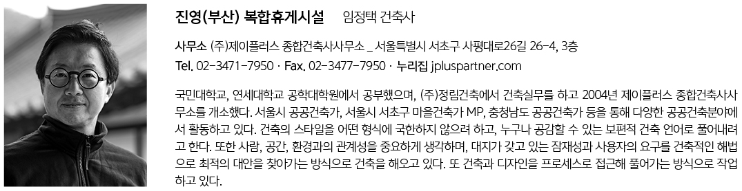 | 진영(부산) 복합휴게시설 설계자 | 임정택 _ (주)제이플러스 종합건축사사무소 건축주 | (주)에스엔디유통 감리자 | (주)포스코이엔씨건축사사무소 시공사 | 남흥건설(주) 설계팀 | 백현국 대지위치 | 경남 김해시 진영읍 하계로96번길 94-4 주요용도 | 관광휴게시설(휴게소) 대지면적 | 78,720.00㎡ 건축면적 | 9,590.88㎡ 연면적 | 10,539.08㎡ 건폐율 | 12.18% 용적률 | 12.72% 규모 | B1F - 3F 구조 | 일반철골구조 외부마감재 | 알루미늄복합패널, 아연도강판쉬트 내부마감재 | 포세린타일, 친환경수성페인트 외 설계기간 | 2016. 02 - 2019. 08 공사기간 | 2019. 10 - 2021. 04 사진 | CA_제임스 정 구조분야 | 미도구조기술사사무소 기계설비분야 | 한길 설비 전기분야 | 원이엔씨 |