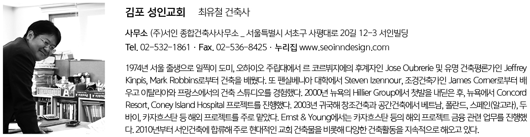 | 김포 성인교회 설계자 | 최동규·최유철 _ (주)서인 종합건축사사무소 건축주 | 대한예수교장로회성인교회 감리자 | 최동규 _ (주)서인 종합건축사사무소 시공사 | (주)마루종합건설 설계팀 | 정동조, 서영진, 서은애, 김판석, 김기태 설계의도 구현 | (주)서인 종합건축사사무소 대지위치 | 경기도 김포시 검단로 908-36 주요용도 | 종교시설(교회) 대지면적 | 1,960.00㎡ 건축면적 | 1,139.91㎡ 연면적 | 2,452.53㎡ 건폐율 | 58.16% 용적률 | 117.46% 규모 | B2F - 4F 구조 | 철근콘크리트구조 외부마감재 | FC패널, 노출 콘크리트, 로이복층유리 내부마감재 | 템바보드, 페인트 설계기간 | 2020. 05 – 2020. 12 공사기간 | 2021. 01 – 2023. 06 사진 | 임준영 구조분야 | (주)이든구조컨설턴트 기계설비분야 | (주)맥엔드엠이씨 전기분야 | (주)대경전기설계사무소 소방분야 | (주)맥엔드엠이씨, (주)대경전기설계사무소 |