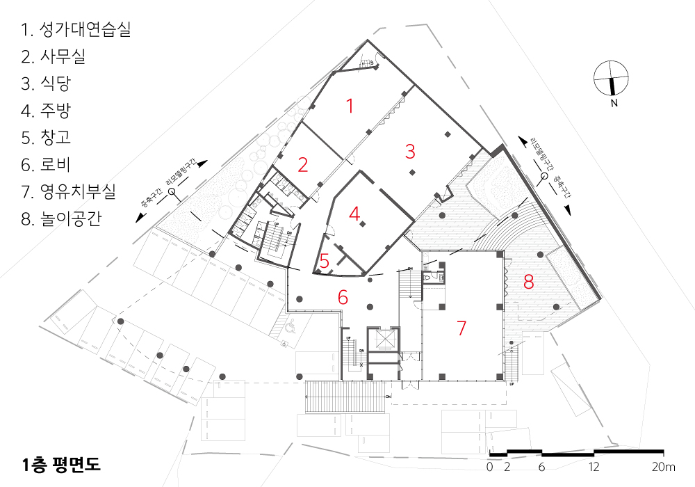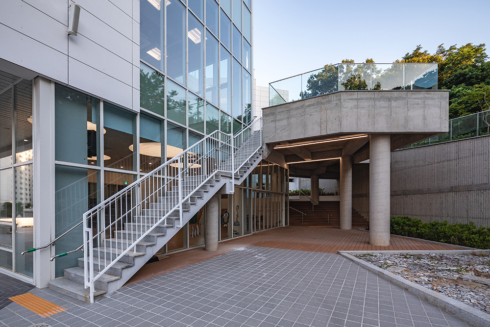 또한 기존 1층과 새로 증축된 층을 정리하며 지하층에 썬큰 가든이 조성됐다. 이 가든은 기존 지하 1층의 식당과 연결되며, 동시에 다이내믹한 놀이공간을 형성한다. 그 사이에는 유아교육관이 자연스레 배치되어 공간의 조화를 이룬다.