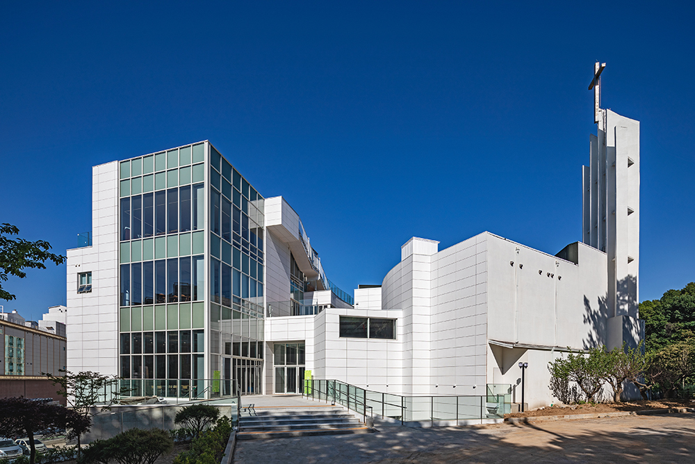 기존 교회에 덧붙여진 캔버스 같은 증축 매스는 정북 일조사선에 의해 세 부분으로 나뉘어 각 부분마다 건축물의 높이가 형성됐다. 높이가 다른 매스들의 상부는 외부 계단으로 연결되어 각 층마다 외부 데크 공간이 형성됐으며, 출입구 반대쪽 측면부는 기존 부채꼴 형태의 예배당과 대응하는 곡면으로 설계되어 기존 교회와 조화를 이룬다. 또한 단조로울 수 있는 입면을 보완하기 위해 예수님의 허리에 창(Lance)이 찔렸던 부분을 형상화한 예수 몸의 큰 창(Window), 오프닝을 두는 동시에 반대로 그 바로 옆 매스는 돌출되도록 디자인해 시각적 변화를 주었다.