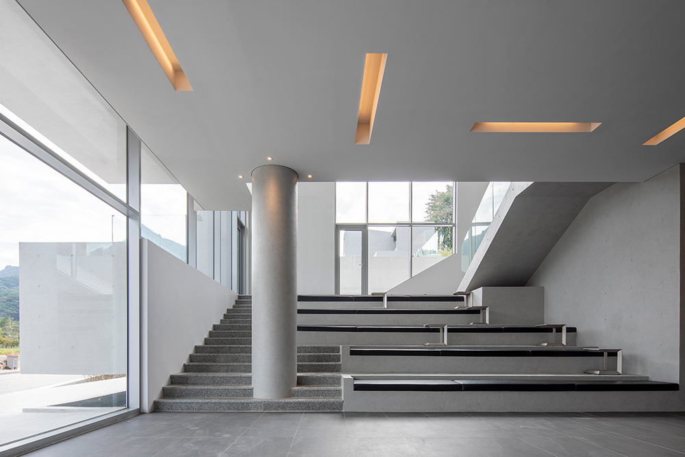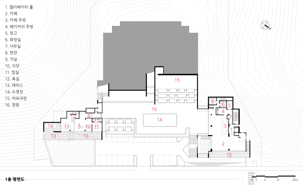 The basement level, which houses support facilities and guest reception areas, is connected to the first-floor café through a voided stand structure, ensuring that the reception and café spaces function complementarily. Outdoor spaces around the café on the first floor were designed to include a communal swimming pool, performance area, and the shared courtyard, providing integrated convenience for both hotel guests and café visitors. A rooftop swimming pool was reserved for hotel guests, offering views of the seasonal changes in Naejangsan.