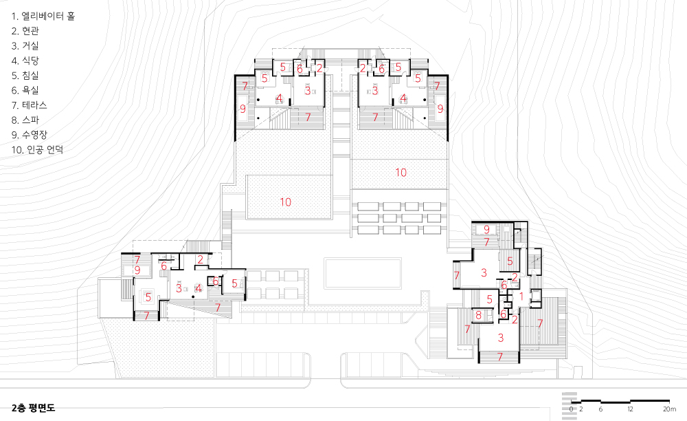 An artificial hill was created above the front performance area of Buildings A, B, and C, to prevent visual disruption between the road and the resort and to maximize views of Naejangsan. Each unit was designed with a skip-floor sectional layout to accommodate the sloped terrain. The resulting height differences were creatively used to design private pools and elevated platforms (maru) for relaxation.