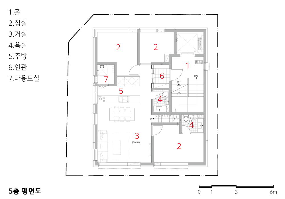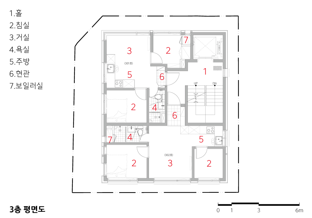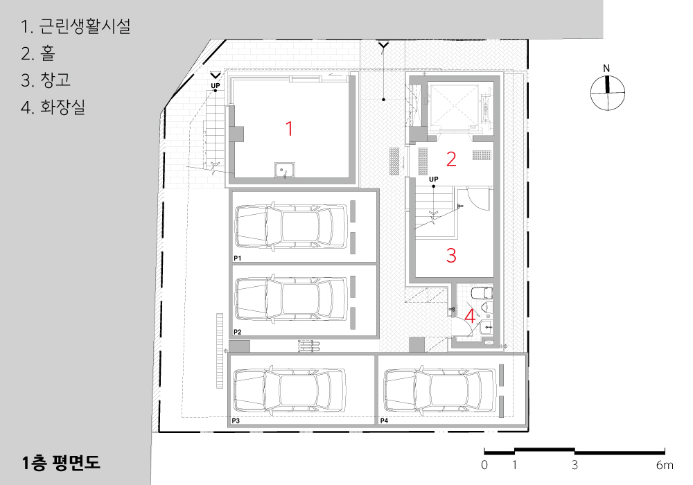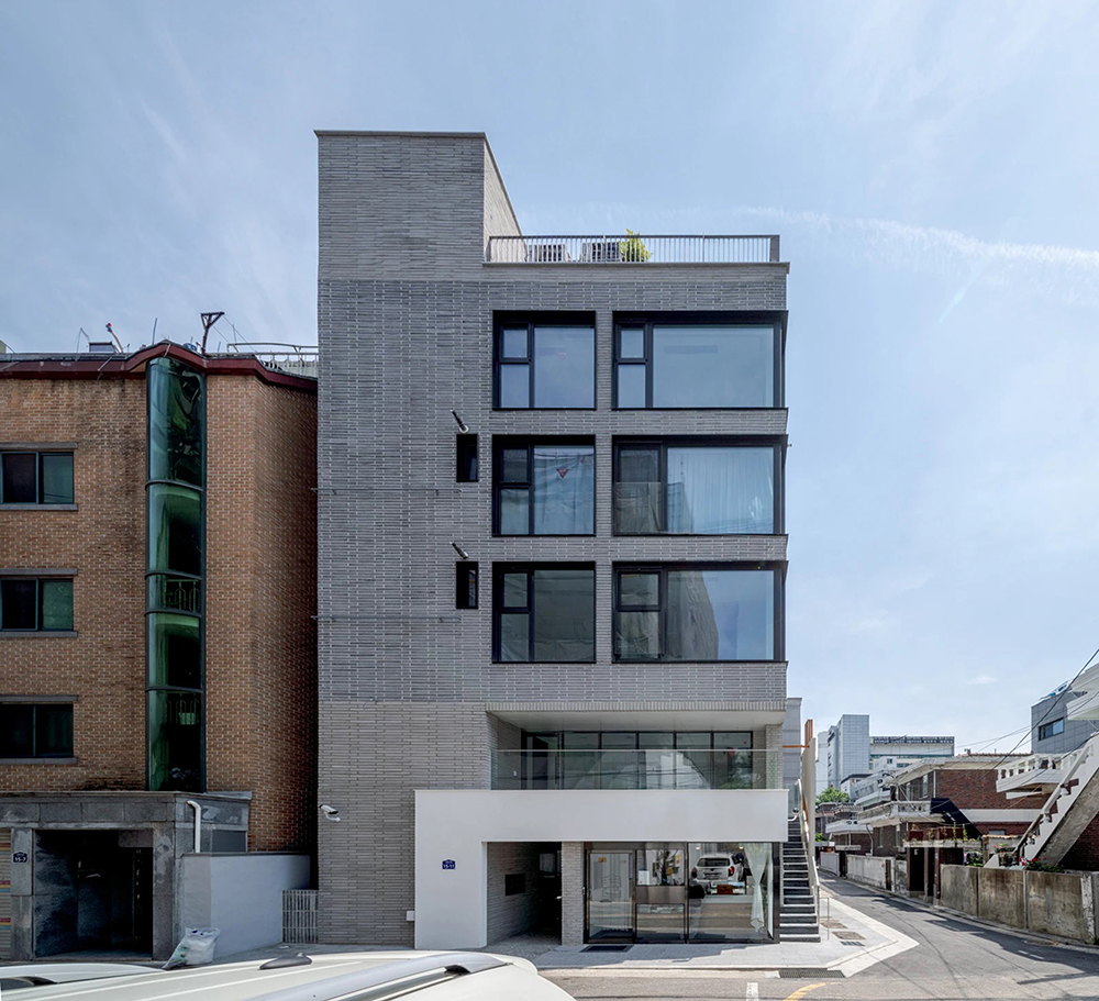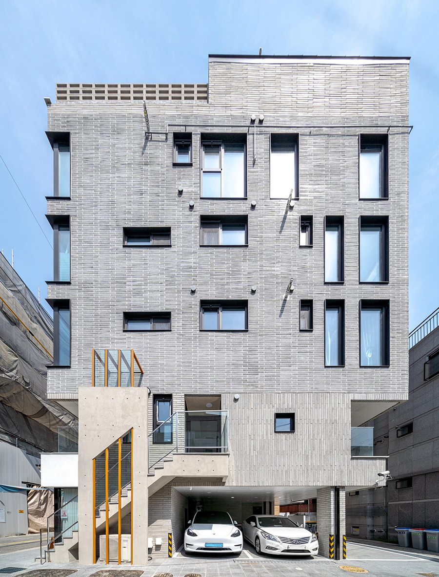 The plot was so small that it was insufficient to accommodate both the required legal parking spaces and a shop on the first floor. After thoroughly exploring a wide range of layout alternatives, we arrived at the most efficient solution that met all the necessary conditions. Maximizing the usable area on the small site was key, so we designed expandable balconies to make the interior space as large as possible. By cleverly utilizing hidden spaces, we overcame the limitations of the small plot. As a result, while the total floor area is approximately 311 square meters (94 pyeong), the actual usable area was expanded to 533 square meters (161 pyeong), successfully maximizing the available space. This approach led to the creation of a mixed-use building that respects and balances each functional area while allowing them to coexist harmoniously.