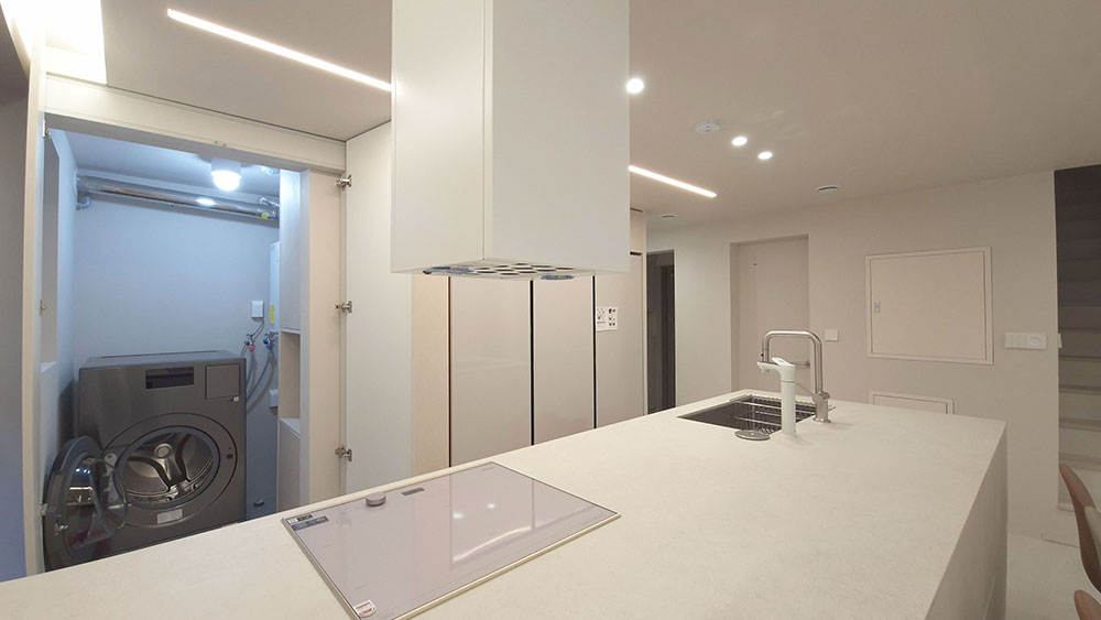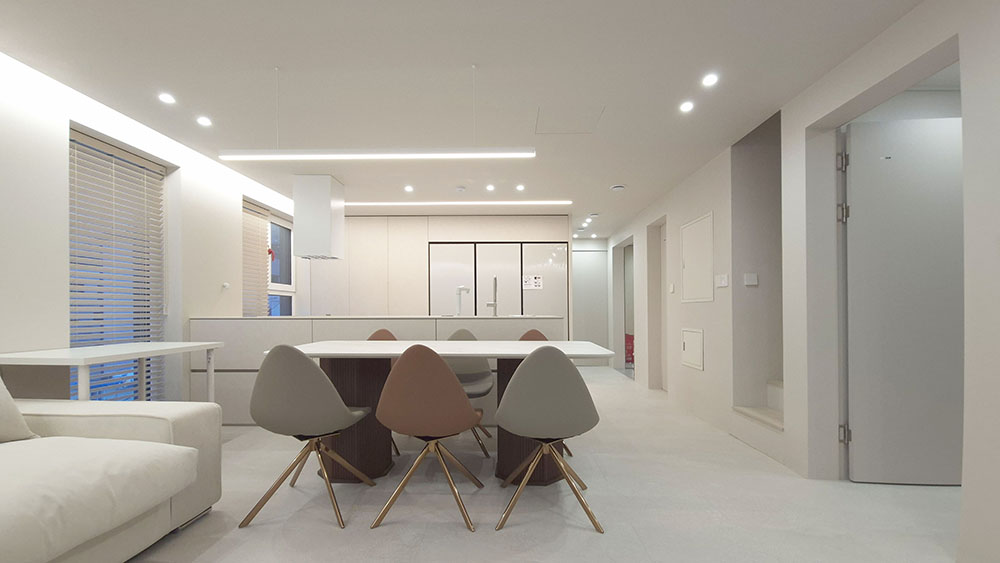 Although the plot was small, the focus was on maximizing the use of space, so I designed the largest possible expandable balconies. The family’s living room was created as an open space, connecting the kitchen and living area, giving it a visually larger and more open feel. I imagined the children playing happily and the entire family gathering and chatting together. This vision led to a design centered on creating a healing space just for the family. As a result, the fifth-floor living space connects to an attic, which in turn opens to an outdoor terrace. Despite being a mixed-use building, this design offers the feel of a detached house, providing a serene environment where the family can interact with nature, even in the midst of the city.