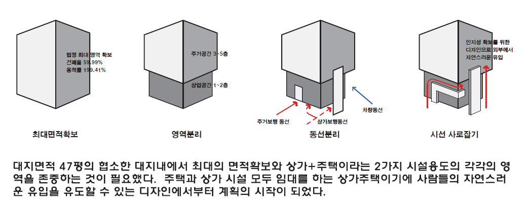 어머니를 모시고 3대가 오랫동안 함께 거주했던 오래된 주택이 도심지 뒷골목에 자리 잡고 있었다. 건축주는 가족이 보다 편안하고 쾌적한 환경에서 생활할 수 있는 방안과 경제적 안전성을 확보하기 위해 수익을 창출할 수 있는 방안을 함께 찾고 있었다. 30대 가장은 수익창출과 가족 거주라는 두 가지 목적을 달성하는 효율적인 건축방식으로, 기존에 살던 집을 철거하고 이곳에 상가시설과 다가구주택이 함께 있는 수익형 부동산을 건축하기로 결심했다.