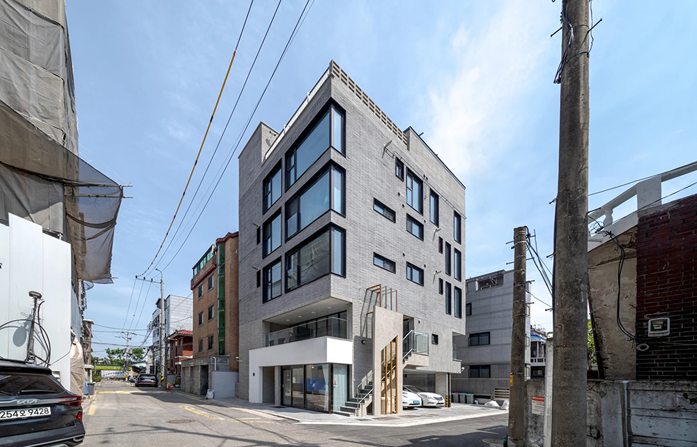 First, since this is a mixed-use building with both commercial and residential spaces, it was essential to thoroughly separate the circulation paths for the commercial and residential areas to maintain privacy and comfort in the living spaces. At the same time, because the building is located in a back alley, it was a priority to design it in a way that would give the building a strong presence and make it noticeable.