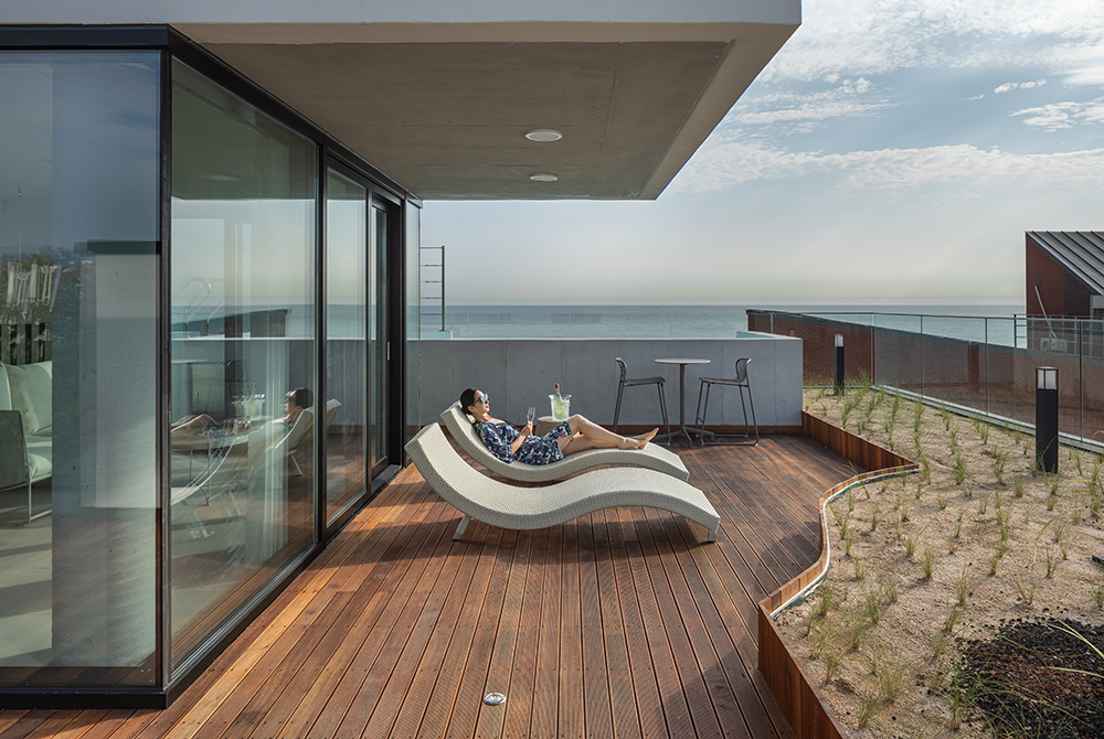 전면도로와 경사진 지형의 높이차가 2개 층 정도 형성된 것을 이용해 지하층에는 주차장에서 진입하여 수직의 진입 동선과 연결하고, 1층에 손님들을 위한 서비스 공간인 카페를 배치하고 넓은 테라스와 폴딩도어를 통해 확장 가능한 공간과 숙박객들이 처음 파도와 만나는 공간을 만들었다. 1층부터 4층까지 층당 하나의 독립된 객실을 만들고, 모두 바다를 향해 열려있는 구조로 만들어 언제나 파도를 만날 수 있게 했다. 1층에서 3층까지의 객실에는 외부 발코니 공간에 바다와 시각적으로 연결되는 수영장을 계획하여 수평선과 연결되게 했으며, 1층 객실은 현관에서 진입하면 썬큰을 만들어 다이닝 공간에서 자연과 접할 수 있도록 배려했다. 최상층 객실은 복층의 형태로 지붕층 테라스 공간과 인피니티 수영장을 계획하여 복층 구조의 다양한 공간의 느낌을 가질 수 있도록 했다.
