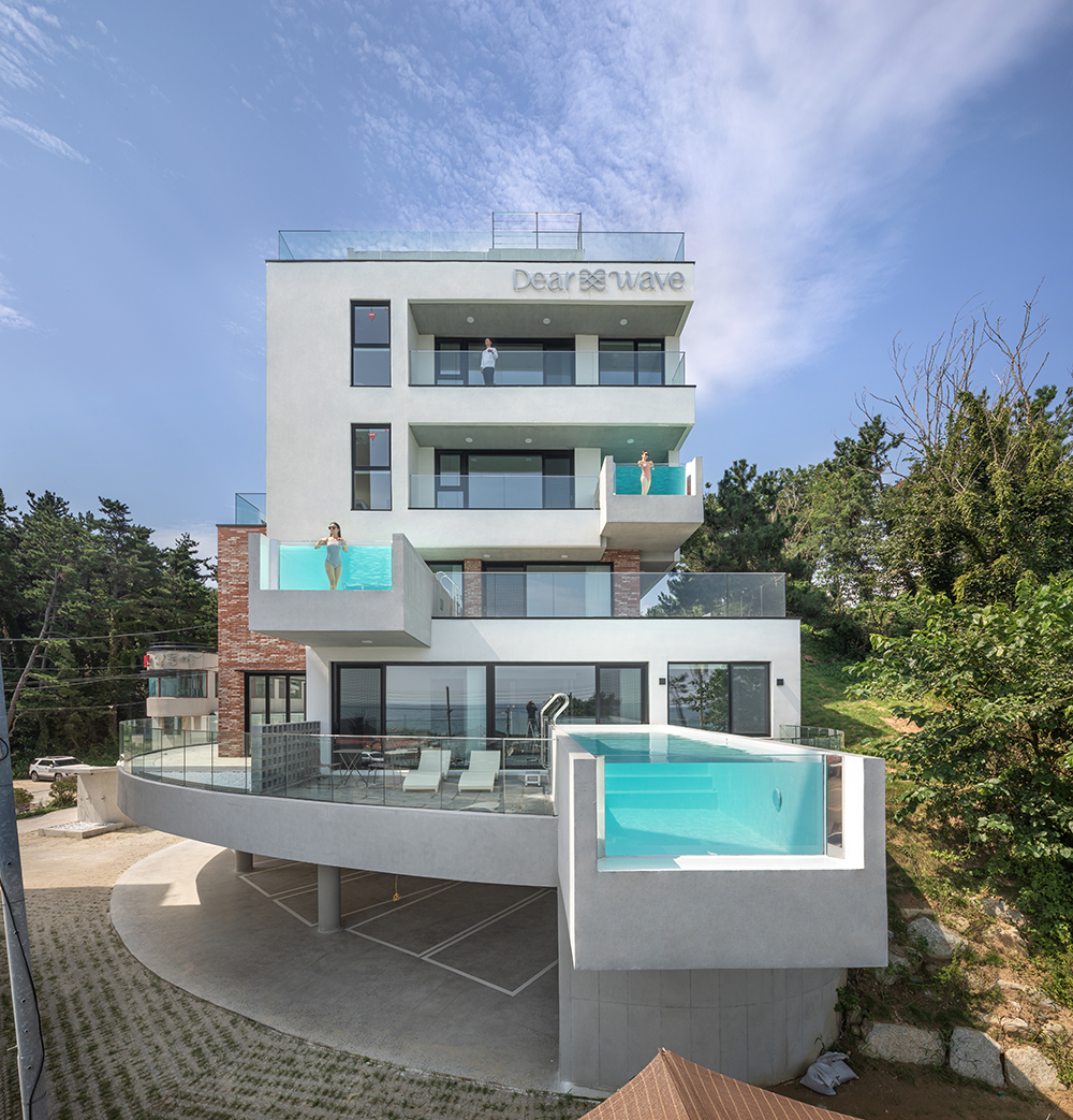 The level difference of about two stories between the front road and the sloping landform was leveraged to place a basement parking lot connected to vertical circulation and place a cafe on the first floor as a service space, along with a spacious terrace and folding doors that enable spatial extension and provide a space for guests to first encounter the view of waves. On each of the first to the fourth floor, one independent guest room was placed, all designed with open structures facing the sea, enabling guests to see the waves anytime. Each guest room from the first to the third floor has an outdoor balcony space where a swimming pool was designed to visually connect with the sea and the horizon. The first-floor guest room was designed to connect with nature through a sunken dining space next to the entrance. The top-floor guest room was designed in a duplex structure, offering various spatial senses with a rooftop terrace and an infinity pool.