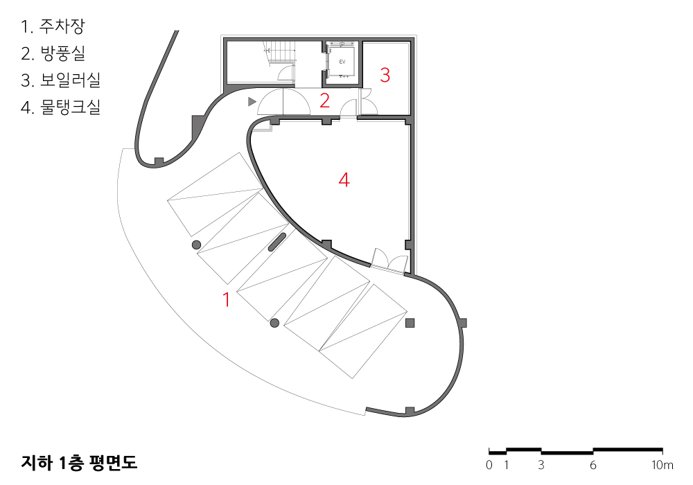 바다 방향으로 도시계획도로가 있지만, 아직 확장되기를 기다리는 상황이라 남측면의 소로를 통해서 진입 동선을 계획했다. 대지는 기존의 자연지형을 온전히 갖고 있어 지형을 이용해 도로에서 직접 진입 가능한 지하층은 주차장과 기계실을 배치하고, 남측면과 서측면 경사지를 이용해 지하에서 1층으로 연결되는 외부 동선과 휴게공간을 계획했다.