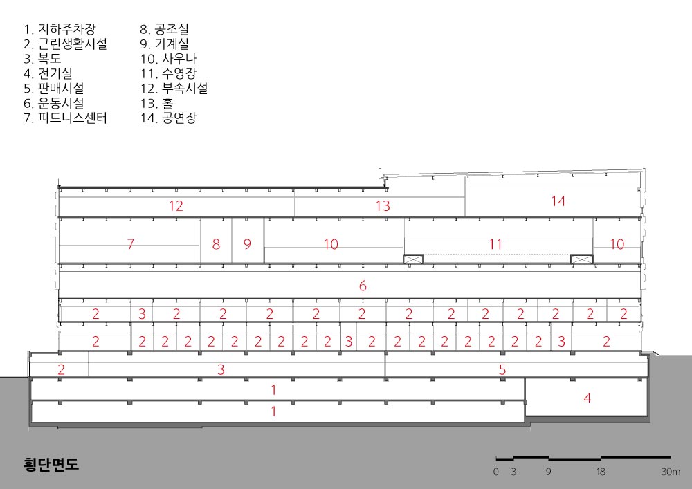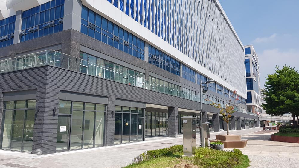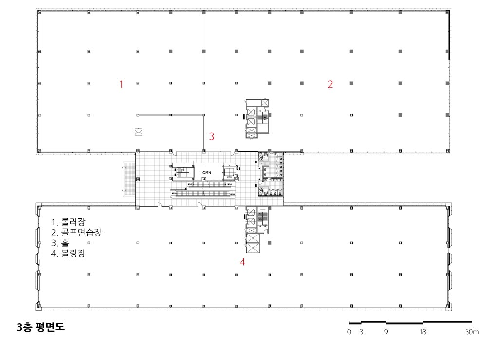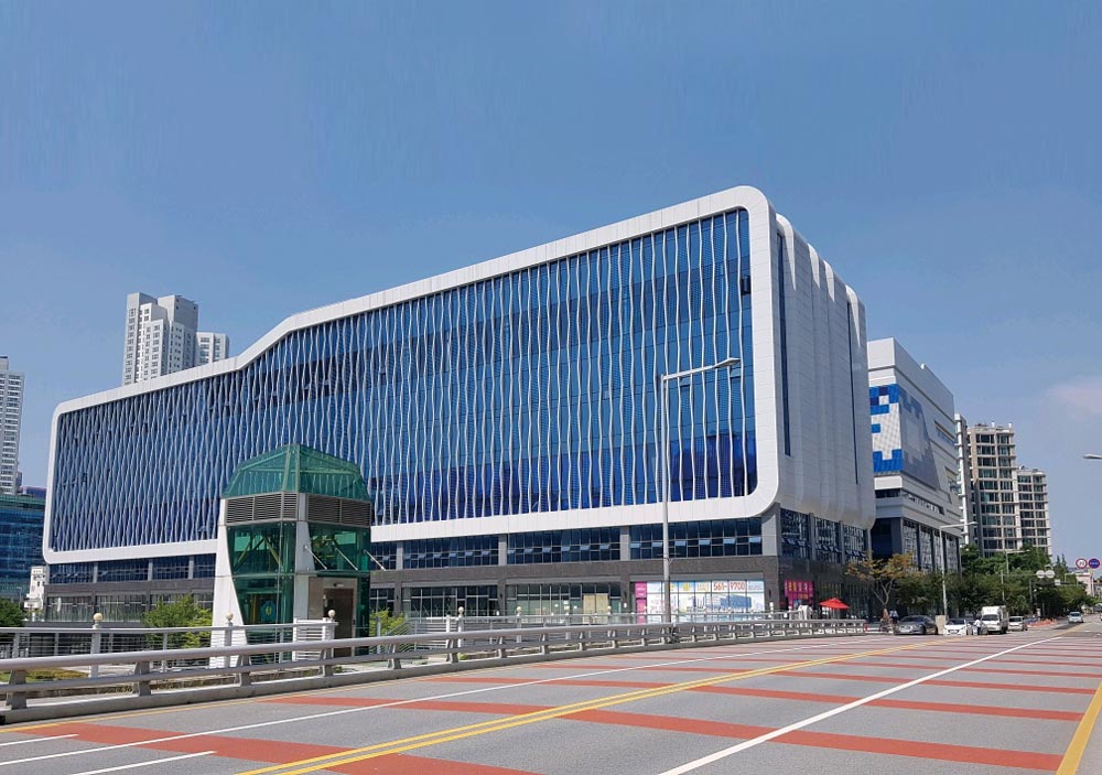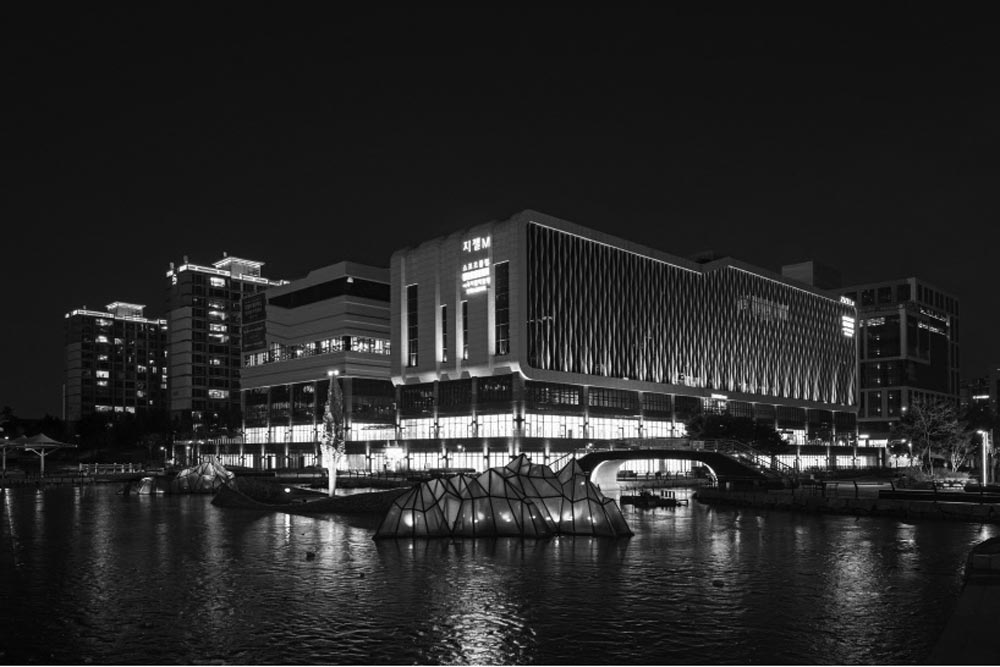It was made as the shape that forms as one with the lake by arranging it go with the lake to express an island which is floating at the side of lake that penetrates Cheongra. It was designed the space between segmented 2 masses as the garden, and formed the space of buffer between a lake and an island, and planned the human traffic to maximize the sale of entered stores in connection with 1st floor and basement floor.