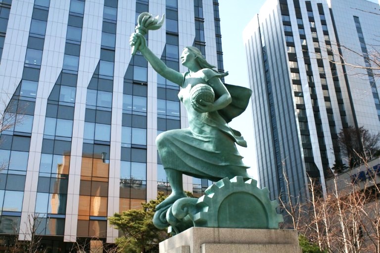 디지털 1단지에 서 있는 ‘수출의 여인상’은 엄청난 왜곡이다. 수출만이 살길이라 우격다짐으로 밀어붙였다. 가발, 섬유, 봉제, 완구, 전자 등 노동집약형 산업에 어린 여성 노동자는 저임금에 시달려야 했고, 가혹한 노동환경에 병을 얻기도 하는 등 착취 속에서 연명해야 했다. 햇볕은커녕 환기도 제대로 되지 않는 먼지투성이 공장에서 하루 대부분을 보내야 했다. 들라크루아의 ‘민중을 이끄는 자유의 여신’을 연상시키는 횃불 든 이 여신상은, 그래서 가짜다. 당시 권력이 조장한 ‘산업역군’이라는 허상의 현시일 따름이다. 인간다운 삶의 권리를 주장하며 저항하는 여성 노동자가 이들의 참모습이다.
